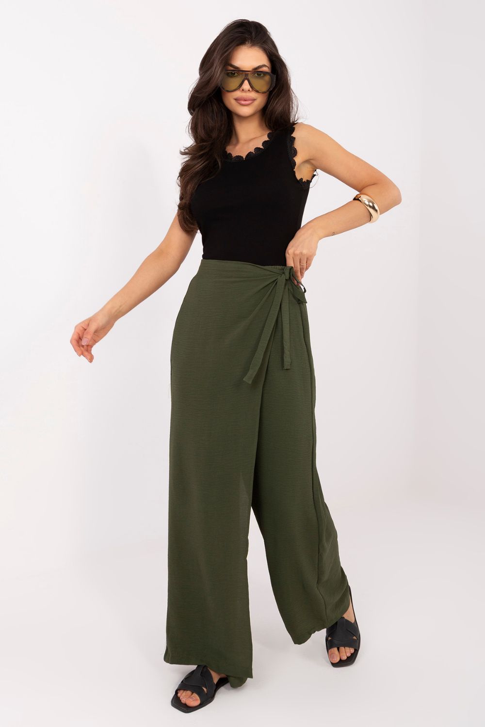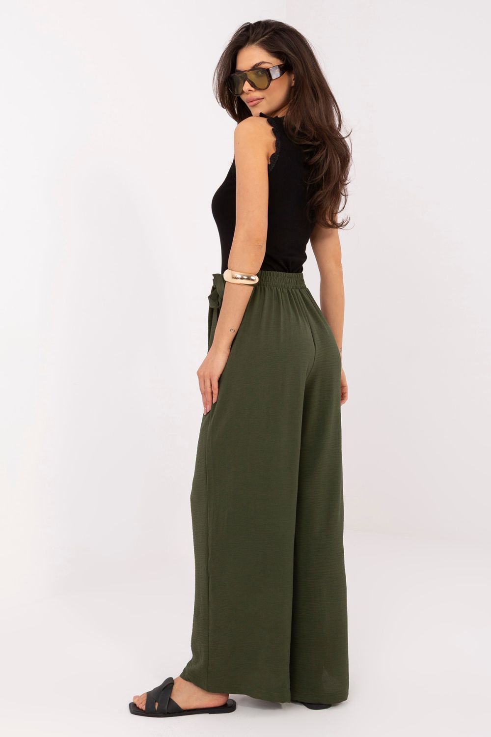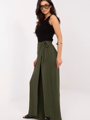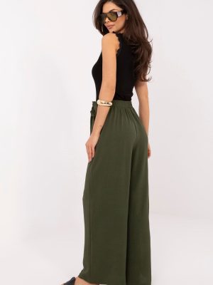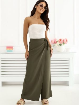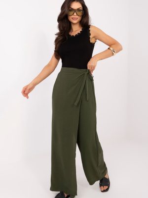Το γυναικείο παντελόνι τύπου wide leg είναι μια κομψή και άνετη πρόταση για καθημερινές εμφανίσεις και για εργασία σε λιγότερο επίσημο στυλ. Η χαλαρή του γραμμή με τα φαρδιά, μακριά μπατζάκια προσφέρει στην σιλουέτα μια αίσθηση ελαφρότητας και σύγχρονου χαρακτήρα, ενώ ταυτόχρονα εξασφαλίζει πλήρη ελευθερία κίνησης. Το μοντέλο διαθέτει ψηλή μέση με ενσωματωμένο λάστιχο, που εγγυάται άνεση κατά την φορεσιά και καλή εφαρμογή στη σιλουέτα. Το ομαλό σχέδιο υπογραμμίζει την ευχρηστία του παντελονιού, διευκολύνοντας τη συνδυαστή του με διάφορα κομμάτια της γκαρνταρόμπας. Κατασκευασμένο από μια ευχάριστη στην αφή μίξη viscose και ελαστάνης, το παντελόνι είναι μαλακό, ελαστικό και προσαρμόζεται καλά στο σώμα. Ένα πρωτότυπο στοιχείο είναι το ύφασμα που μιμείται το μπροστινό μέρος φούστας, που στερεώνεται με δέσιμο στη μέση, προσθέτοντας μια μοναδική, μοντέρνα αίσθηση στο σύνολο. Το μοντέλο χωρίς τσέπες διατηρεί μια μινιμαλιστική μορφή, ιδανική για κομψές και casual εμφανίσεις. Είναι μια εξαιρετική επιλογή για γυναίκες που εκτιμούν την άνεση και τον σύγχρονο σχεδιασμό. Σημειώσεις: Το μέγεθος στην ετικέτα είναι M/L, όμως το μοντέλο βγαίνει μικρότερο, αντιστοιχεί στο μέγεθος S/M (μειωμένο).