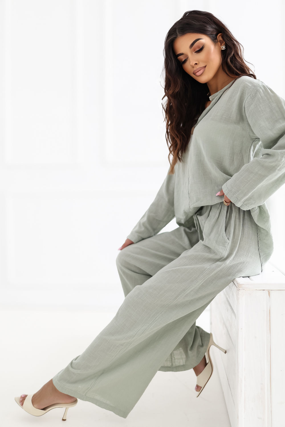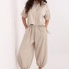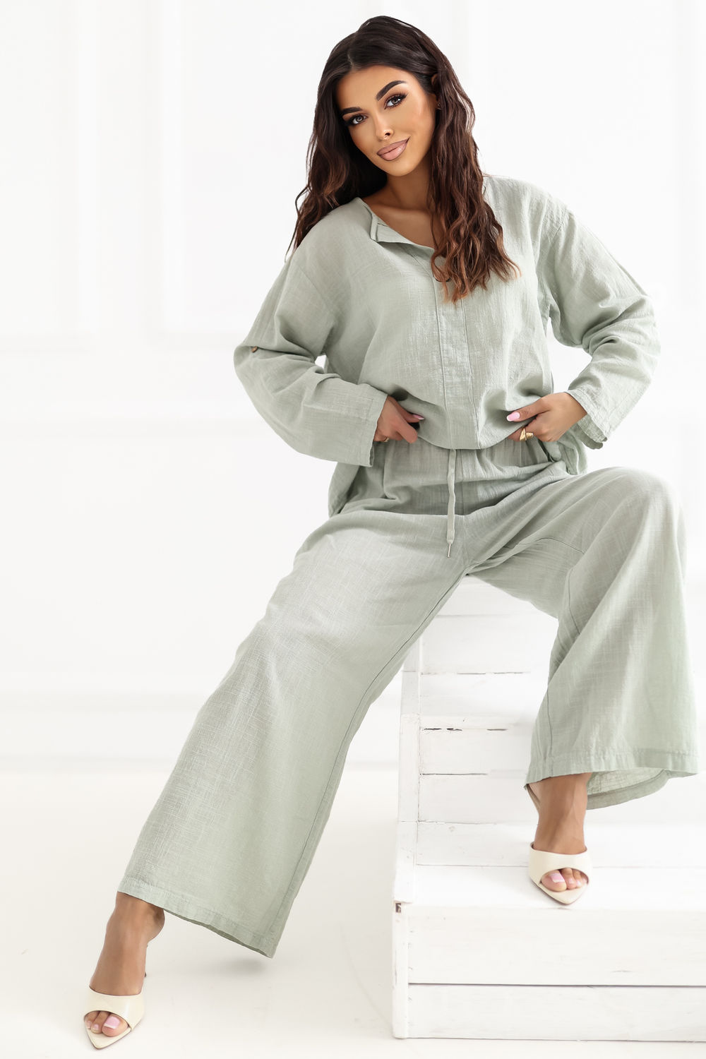 Στυλάτες γυναικείες παντελόνες με φαρδιά γραμμή, που συνδυάζουν την άνεση με τη μοντέρνα, χαλαρή στυλιστική προσέγγιση. Το μοντέλο διαθέτει φαρδιές γραμμές, προσφέροντας πλήρη ελευθερία κινήσεων και ενσωματώνοντας τέλεια τις τρέχουσες τάσεις. Τα παντελόνια είναι κατασκευασμένα από υψηλής ποιότητας βαμβάκι, το οποίο είναι μαλακό, διαπνέον και ευχάριστο στην αφή, γεγονός που τα καθιστά ιδανικά για καθημερινή χρήση. Η απλή σχεδίαση τονίζει τον καθολικό τους χαρακτήρα και διευκολύνει την προσαρμογή σε πολλές στυλιστικές προτάσεις. Το μοντέλο με τη ψηλή μέση αναδεικνύει όμορφα τη μέση, ενώ η ζώνη στη μέση επιτρέπει άμεσο προσαρμογή στη σιλουέτα. Ανάμεσα στα πλεονεκτήματα περιλαμβάνονται οι πρακτικές πλάγιες εσωτερικές τσέπες, που αυξάνουν την λειτουργικότητα των παντελονιών. Πρόκειται για μια εξαιρετική πρόταση τόσο για casual όσο και για πιο κομψές εμφανίσεις.