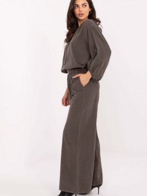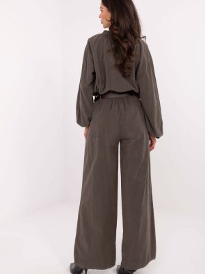 Stylowe παντελόνια καμπαρντίνης σε καθημερινό στυλ, ιδανικά για καθημερινή χρήση. Κατασκευασμένα από μαλακό υλικό με υψηλή περιεκτικότητα πολυεστέρα, εξασφαλίζουν άνεση και ευκολία κατά τη διάρκεια της ημέρας. Το μοντέλο διαθέτει ψηλή μέση με ραμμένο λάστιχο, που εγγυάται τέλεια εφαρμογή στη σιλουέτα και άνεση στις κινήσεις. Οι φαρδιές γάμπες τύπου wide leg προσδίδουν στα παντελόνια σύγχρονη, ελαφρώς ρετρό χαρακτήρα, ενώ οι πλευρικές τσέπες αυξάνουν τη λειτουργικότητά τους. Το σύνολο ολοκληρώνεται με μια κουμπωτή ζώνη, που τονίζει τη μέση και ολοκληρώνει τον στιλάτο εμφάνιση. Αυτά τα παντελόνια από ύφασμα είναι μια εξαιρετική επιλογή για γυναίκες που εκτιμούν την ελευθερία και τον κομψό μινιμαλισμό στις καθημερινές τους στυλιστικές επιλογές.