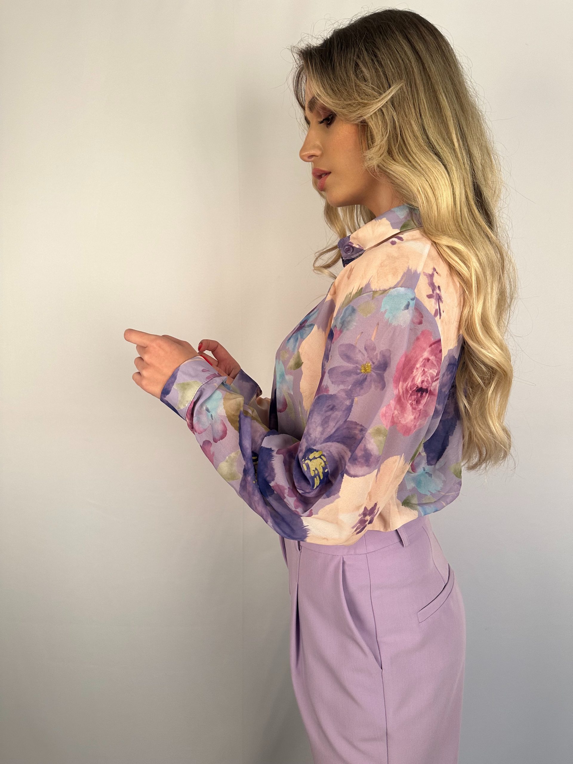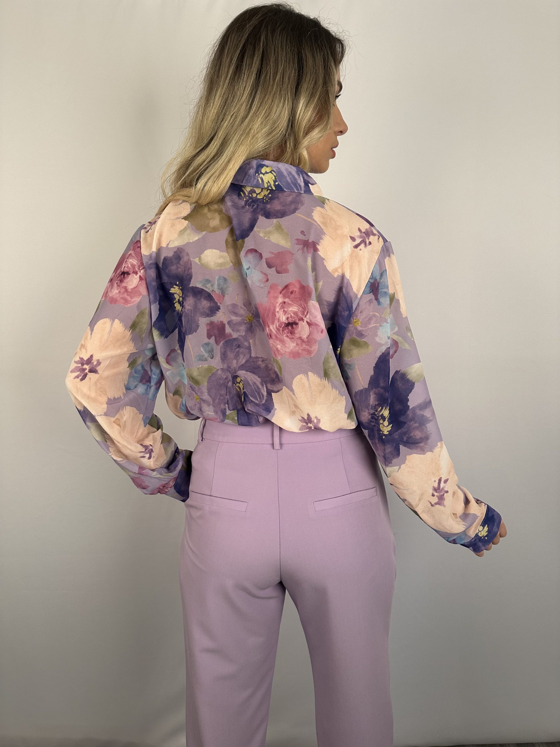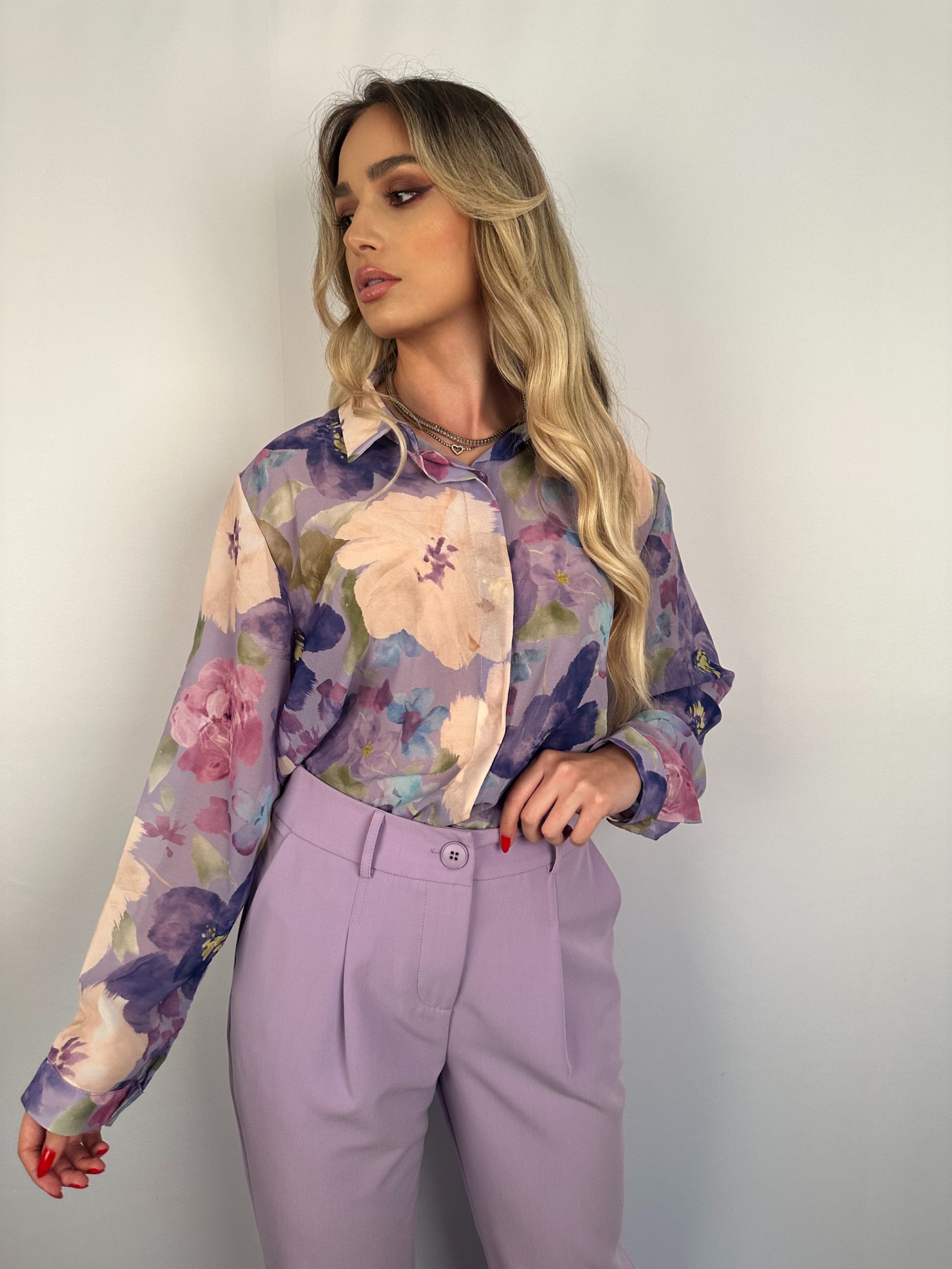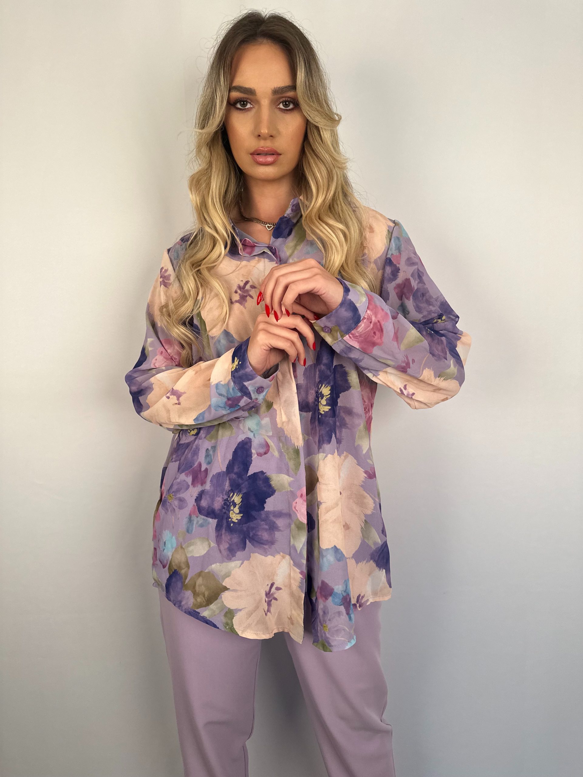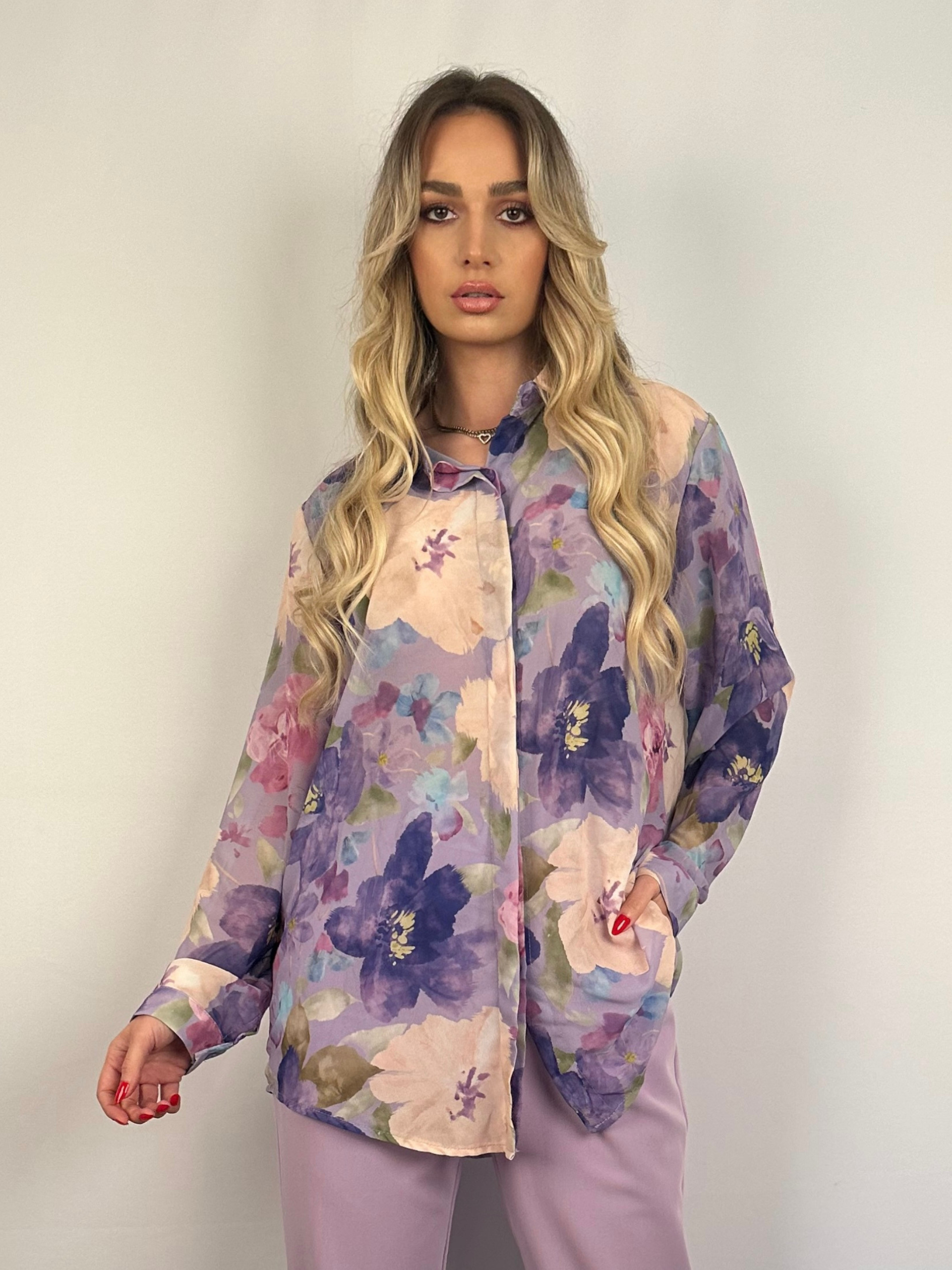 Πουκάμισο σε άνετη γραμμή, μακρύ μανίκι, κλείνει με κρυφά κουμπάκια από πάνω έως κάτω.