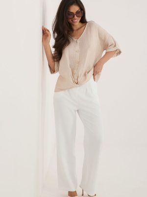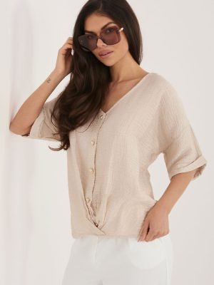 Γυναικεία πουκάμισο με ελαφριά και άνετη γραμμή, ιδανικό για καθημερινές στυλιστικές επιλογές. Κατασκευασμένο από ευχάριστο υλικό που συνδυάζει βισκόζη και νάιλον, προσφέροντας έτσι έναν αεράτο, ελαφρύ και καλοσχηματισμένο στους χαρακτήρες σχήμα. Το μοντέλο ξεχωρίζει για την ποικίλη υφή του υλικού, που προσδίδει στο πουκάμισο ένα ενδιαφέρον και κομψό χαρακτήρα. Το πουκάμισο δεν έχει γιακά, ενώ η V-γραμμή του ντεκολτέ τονίζει διακριτικά την γραμμή του λαιμού και προσθέτει μία θηλυκή ελαφρότητα στο σύνολο. Το κοντό μανίκι καθιστά το μοντέλο ιδανικό για πιο ζεστές μέρες. Το κανονικό μήκος επιτρέπει να φορεθεί είτε μέσα σε παντελόνια ή φούστες είτε σε πιο χαλαρή διάταξη. Η κουμπωτή κλεισίματος είναι πρακτική και διευκολύνει τη διαδικασία ένδυσης, ενώ ταυτόχρονα αποτελεί ένα κλασικό στοιχείο φινιρίσματος.