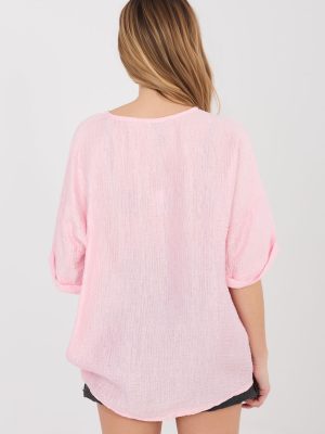 Γυναικεία πουκάμισα με ελαφρύ και άνετο κόψιμο, ιδανικά για καθημερινά στυλ. Κατασκευασμένο από ευχάριστο στο άγγιγμα ύφασμα που είναι μείγμα από βισκόζη και νάιλον, γεγονός που το καθιστά διαπνέον, ελαφρύ και που εφαρμόζει καλά στη σιλουέτα. Το μοντέλο ξεχωρίζει για την ποικιλία υφής του υλικού, που προσδίδει στο πουκάμισο έναν ενδιαφέρον και στιλάτο χαρακτήρα. Το πουκάμισο δεν έχει γιακά και η λαιμόκοψη σε σχήμα V υπογραμμίζει διακριτικά τη γραμμή του λαιμού και προσθέτει γυναικεία ελαφρότητα στο σύνολο. Το κοντό μανίκι κάνει το μοντέλο να είναι ιδανικό για πιο ζεστές μέρες. Το κανονικό μήκος επιτρέπει να φορεθεί είτε μέσα από παντελόνι ή φούστα, είτε χαλαρά. Το κούμπωμα με κουμπιά είναι πρακτικό και διευκολύνει τη διαδικασία του φορέματος, ενώ ταυτόχρονα αποτελεί κλασικό στοιχείο φινιρίσματος.
