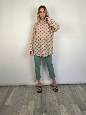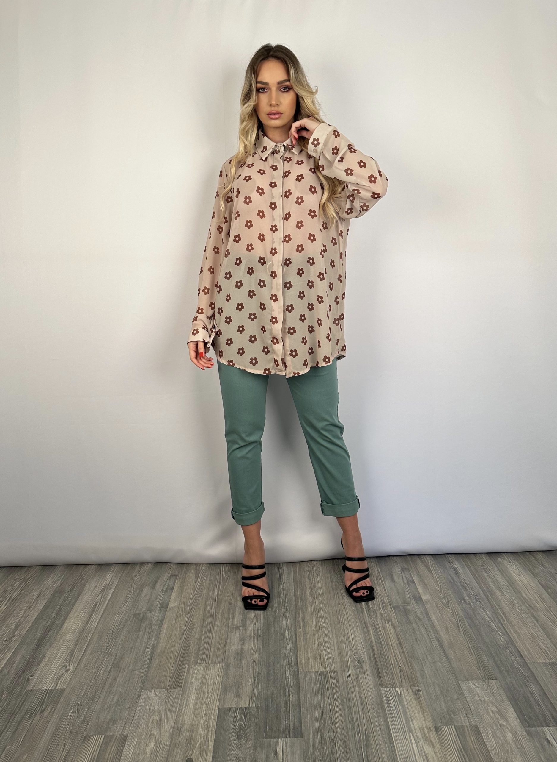 Πουκάμισο σε άνετη γραμμή, μακρύ μανίκι, κλείνει με κρυφά κουμπάκια από πάνω έως κάτω.