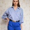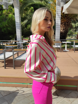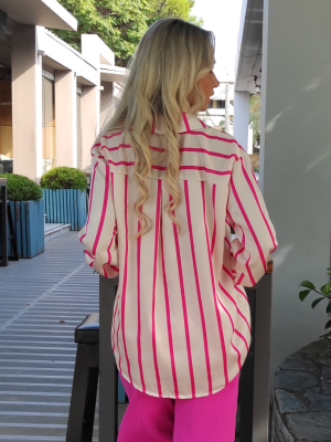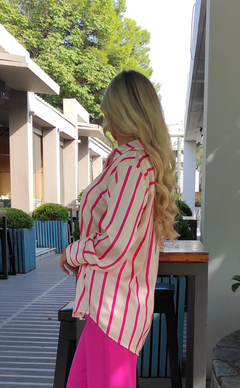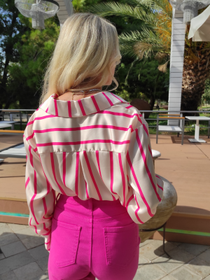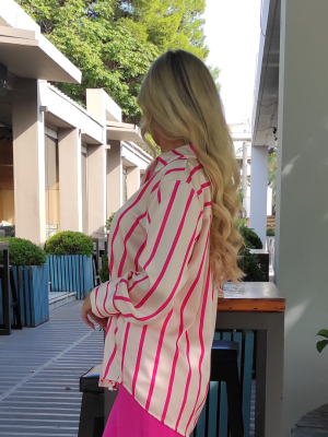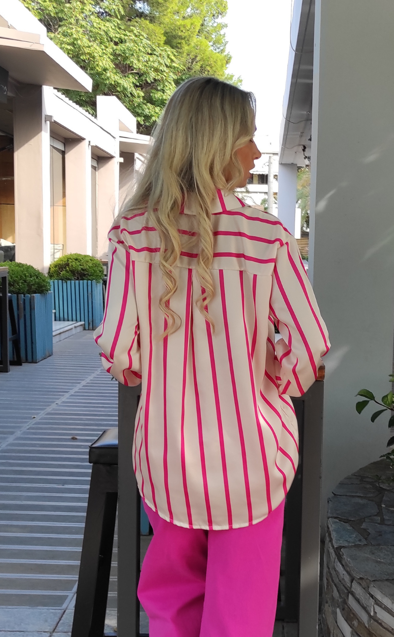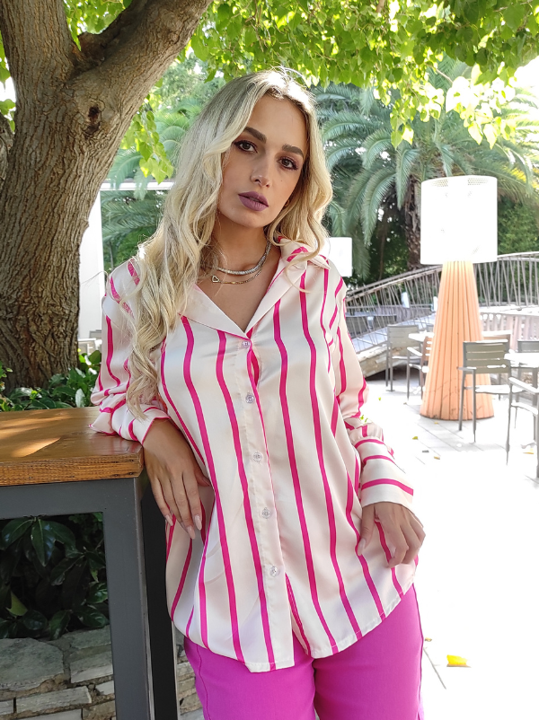 Πουκάμισο τύπου σατέν, ριγέ σε μπεζ – φούξια χρώμα, άνετη γραμμή.