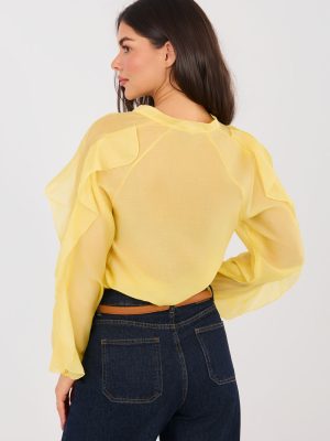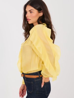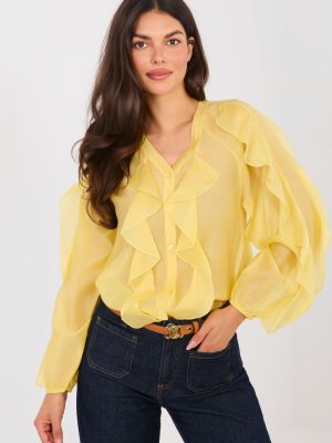 Το κομψό γυναικείο πουκάμισο χωρίς γιακά είναι μια στυλάτη πρόταση που συνδυάζει άψογα την κλασική κομψότητα με τη σύγχρονη ελαφρότητα. Ιδανικό για επίσημες περιστάσεις, για τη δουλειά, καθώς και για καθημερινές, κομψές εμφανίσεις. Το ομαλό σχέδιο του προσδίδει διαχρονικό χαρακτήρα και διευκολύνει τη συνδυαστικότητα με άλλα στοιχεία της γκαρνταρόμπας. Το πουκάμισο είναι κατασκευασμένο από υψηλής ποιότητας τενσέλ με προσθήκη ελαστάνης, εξασφαλίζοντας απαλότητα, αερισμό και άνεση κατά τη διάρκεια της ημέρας, ενώ ταυτόχρονα προσαρμόζεται ευαίσθητα στη σιλουέτα. Το κανονικό μήκος του κάνει το μοντέλο να φαίνεται εξαιρετικά είτε φορεμένο μέσα από παντελόνια είτε χαλαρά. Το μοντέλο διαθέτει μακρύ, φουσκωτό μανίκι, το οποίο προσθέτει μια γυναικεία και κομψή έκφραση στο σύνολο. Ο ντεκολτέ σε V υπογραμμίζει διακριτικά το λαιμό και τονίζει τη σιλουέτα. Το κλείσιμο με κουμπιά ενισχύει τον κλασικό χαρακτήρα του πουκαμίσου, ενώ οι φρουφρούδες μπροστά και στα μανίκια αποτελούν έναν εντυπωσιακό, διακοσμητικό τόνο, προσδίδοντας στο πουκάμισο ελαφρότητα και μοναδικό στυλ. Είναι η ιδανική επιλογή για γυναίκες που εκτιμούν την κομψότητα, την άνεση και τις λεπτομέρειες που έχουν προσέξει.