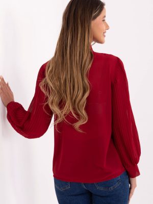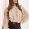 Μια κομψή και γυναικεία γυναικεία πουκάμισο, που είναι ιδανική τόσο για καθημερινή χρήση, στη δουλειά, όσο και για επίσημες περιστάσεις. Κατασκευασμένο από υψηλής ποιότητας μείγμα πολυεστέρα και ελαστάνης, είναι ελαφρύ, ελαστικό και ευχάριστο στην αφή, εξασφαλίζοντας άνεση κατά τη διάρκεια της ημέρας. Το μοντέλο έχει κλασικό γιακά και κούμπωμα με κουμπιά, τα οποία του προσδίδουν μια κομψή, διαχρονική αίσθηση. Η προσοχή ελκύεται από τη πλισέ ζακέτα με κόμπο μπροστά, που αποτελεί μια εντυπωσιακή, γυναικεία λεπτομέρεια. Τα μακριά, πλισέ μανίκια προσθέτουν μια υποβλητική ποικιλία στο σύνολο και δίνουν στην πουκαμίσα μια μοναδική κομψότητα. Χάρη στο λείο ύφασμα και το κανονικό μήκος, η πουκάμισα παρουσιάζεται εξαιρετικά τόσο σε συνδυασμό με φούστα όσο και με παντελόνια, δημιουργώντας ένα στυλάτο σύνολο για το γραφείο ή για ειδικές περιστάσεις.