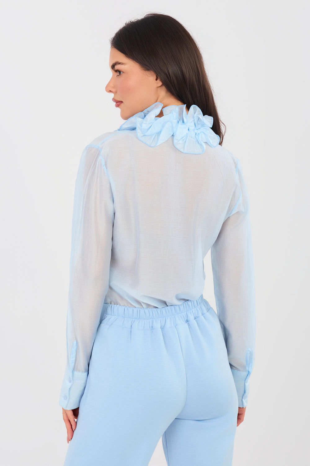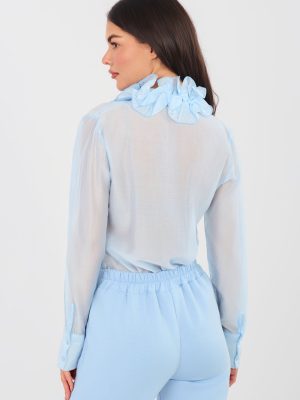 Η γυναικεία πουκαμίσα από διαφανές υλικό είναι μια κομψή πρόταση που συνδυάζει την κλασική γραμμή με τη διακριτική κομψότητα. Κατασκευασμένη από ελαφρύ, λεπτό ύφασμα τενσέλ με πρόσθετο πολυέστερ, εφαρμόζει όμορφα στο σώμα και προσδίδει στη συνολική εμφάνιση ελαφρότητα και εκλεπτυσμένο χαρακτήρα. Η κλασική γραμμή με το κανονικό μήκος συμπληρώνεται με μακριά μανίκια και λαιμόκοψη με στεφάνωμα, που τονίζει το κομψό στυλ της πουκαμίσας. Το κούμπωμα με κουμπιά εξασφαλίζει άνεση κατά την φόρεση και επιτρέπει την προσαρμογή της πουκαμίσας σε διάφορες περιστάσεις. Ένα ιδιαίτερο στοιχείο του μοντέλου είναι το ζαμπόν, που προσθέτει κομψότητα και γυναικεία φινέτσα, καθιστώντας την πουκαμίσα ιδανική επιλογή τόσο για επίσημες εξόδους, όσο και για τη δουλειά, καθώς και για πιο κομψές καθημερινές εμφανίσεις. Ο απλός σχεδιασμός καθιστά την πουκαμίσα ιδανική για συνδυασμούς με σακάκι, υφασμάτινα παντελόνια ή φούστα, δημιουργώντας διαχρονικά και κομψά σύνολα.