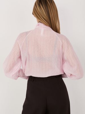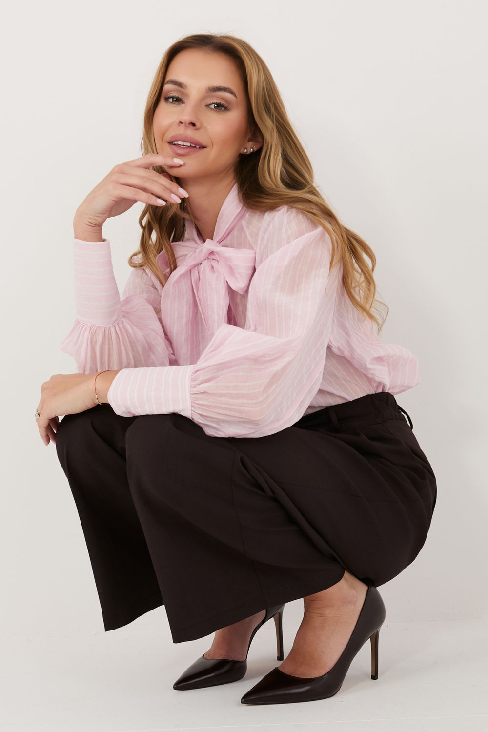 Γυναικίσια πουκαμίσα κλασικής γραμμής, η οποία είναι ιδανική τόσο για καθημερινές εμφανίσεις, όσο και για επαγγελματικές ή πιο επίσημες περιστάσεις. Το μοντέλο έχει κανονικό μήκος, κλείνει με κουμπιά και συνδυάζει την διαχρονική κομψότητα με σύγχρονες λεπτομέρειες. Είναι φτιαγμένο από ένα ευχάριστο μείγμα λυοσέλ και πολυεστέρα, προσφέροντας άνεση και ανθεκτικότητα. Το ύφασμα είναι διακοσμημένο με μια διακριτική ρίγα, που προσθέτει ελαφρότητα και στυλ στο σύνολο. Η πουκαμίσα διαθέτει φουσκωτά μανίκια που καταλήγουν σε φαρδιές μανσέτες, οι οποίες προσδίδουν έμφαση στη σιλουέτα. Ένα επιπλέον πλεονέκτημα είναι ο φιόγκος στον λαιμό, που επιτρέπει τη δημιουργία μιας κομψής κορδέλας ή ενός χαλαρού κόμπου ανάλογα με την περίσταση.