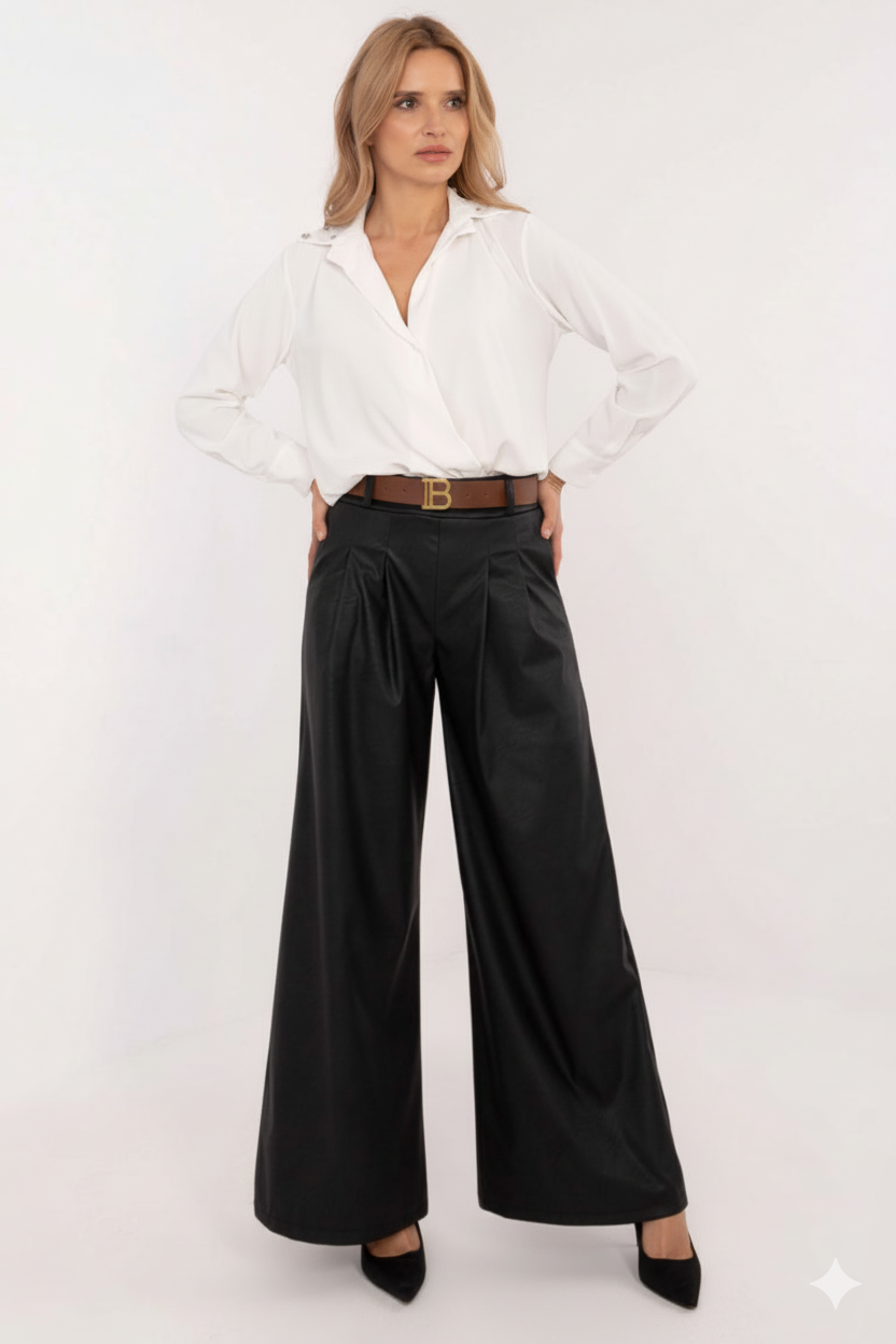 Εμφάνιση που εκπέμπει εκλεπτυσμένη δύναμη λόγω του κομψού λευκού πουκαμίσου και της φαρδιάς μαύρης παντελόνας που τονίζει δυναμικά τη σιλουέτα. Το απόλυτο total black and white contrast.
