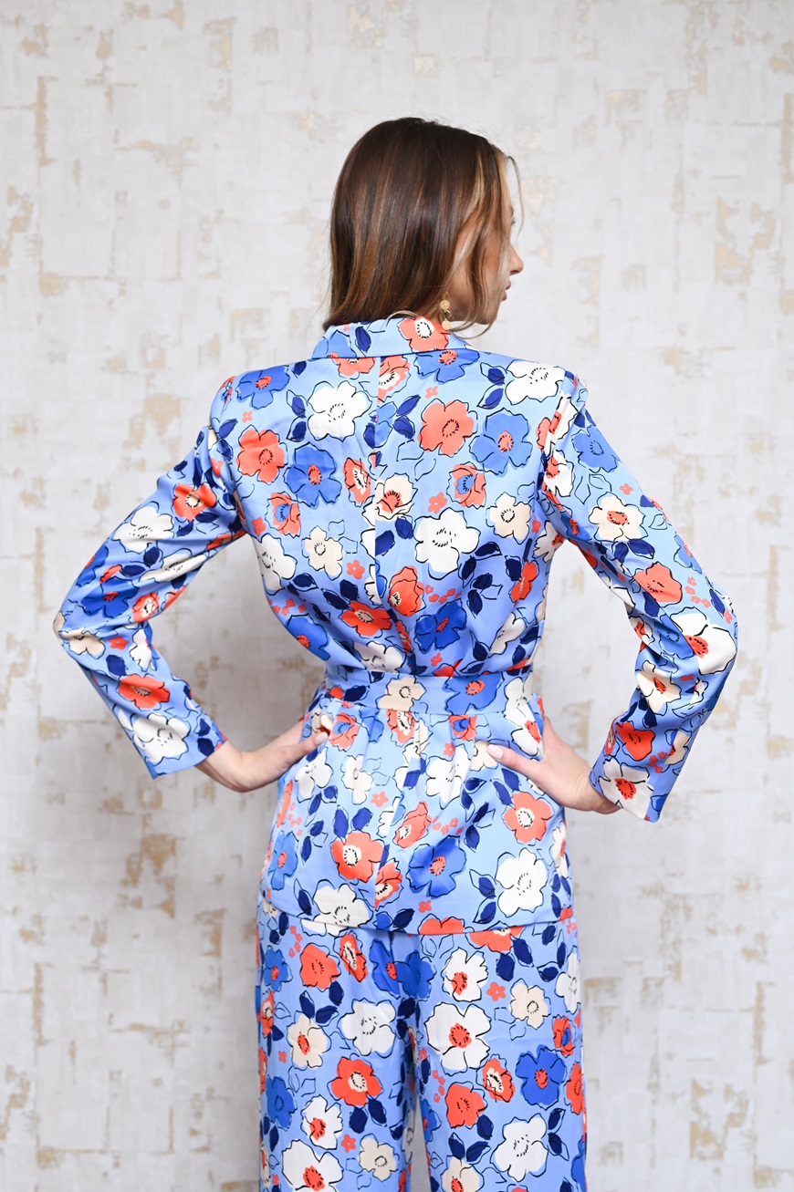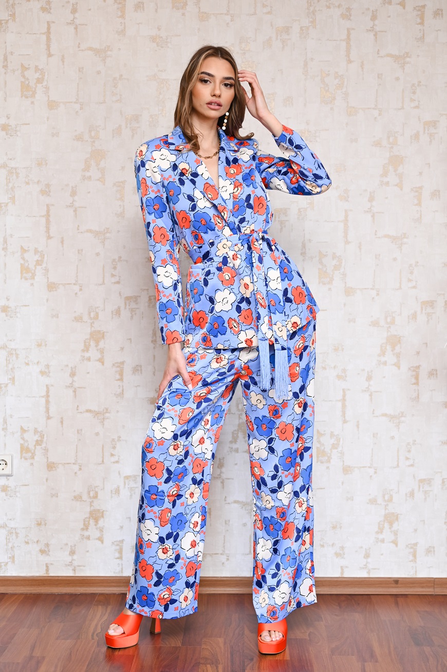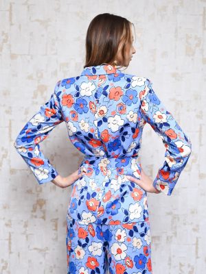 Σακάκι φλοράλ, σατέν με ζώνη στη μέση με κρόσσια, κουμπί ,διακοσμητικές τσέπες μπροστά και εσωτερική φόδρα. Σε κανονική γραμμή.