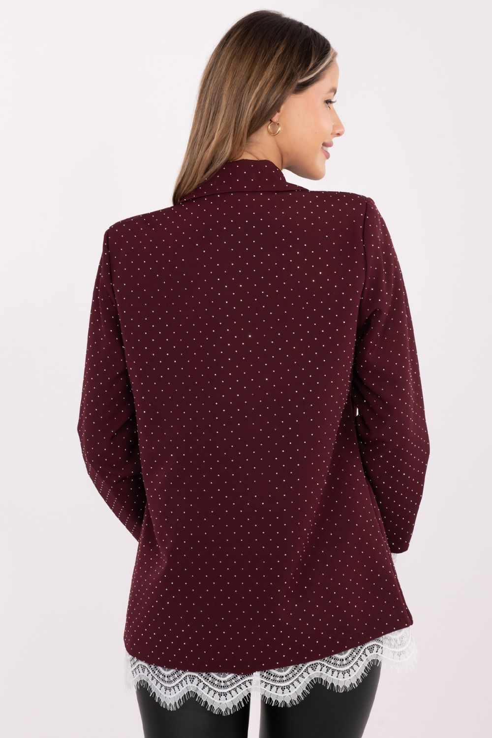 Η κομψή γυναικεία σακάκι αποτελεί μια εξαιρετική πρόταση για επισκέψεις και κοινωνικές εκδηλώσεις, ιδανική για γυναίκες που εκτιμούν το στυλ και τις εντυπωσιακές λεπτομέρειες. Το μοντέλο με κανονικό μήκος εντυπωσιάζει με την προσεγμένη φινέτσα και τον εκλεπτυσμένο χαρακτήρα του. Η σακάκι διαθέτει καπιτονέ πέτα, ενσωματωμένα μαξιλάρια στους ώμους και κουμπί μίας σειράς που υπογραμμίζει τη κλασική μορφή και την κομψή γραμμή της σιλουέτας. Ολόκληρη η επιφάνεια του υλικού διακοσμείται με εφαρμογές από τζετ, προσδίδοντας στην εμφάνιση μια πολυτελή, κοσμηματική αίσθηση που τραβάει τα βλέμματα. Ιδιαίτερη έμφαση δίνεται στο δαντελένιο τελείωμα στο κάτω μέρος του σακακιού και στα μακριά μανίκια, προσθέτοντας ελαφρότητα και γυναικεία γοητεία. Το μοντέλο, κατασκευασμένο από συνδυασμό πολυεστέρα και ελαστάνης, εξασφαλίζει άνεση κατά τη διάρκεια της φοράς και καλή εφαρμογή στη σιλουέτα. Η επένδυση αυξάνει την άνεση και επιτρέπει στο σακάκι να τοποθετείται άψογα στο σώμα. Είναι μια εξαιρετική επιλογή για γυναίκες που αναζητούν ένα κομψό και ταυτόχρονα εντυπωσιακό σακάκι για ιδιαίτερες περιστάσεις.