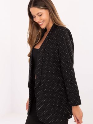 Η κομψή γυναικεία σακάκι χωρίς κουμπιά είναι ένα μοναδικό στοιχείο της γκαρνταρόμπας, ιδανικό για πάρτι, επαγγελματικές συναντήσεις και ειδικές περιστάσεις. Κατασκευασμένο από μείγμα πολυεστέρα και βισκόζης, με επένδυση για άνεση κατά τη διάρκεια της φ wearing. Τα πέτα που προεξέχουν και οι ραμμένες θήκες στους ώμους προσδίδουν στο σακάκι μια κλασική, εκλεπτυσμένη γραμμή. Ολόκληρη η επιφάνεια του υφάσματος κοσμείται από εφαρμογές με λαμπερά στρας που τραβούν την προσοχή και προσθέτουν γκλάμουρ στην εμφάνιση. Το κανονικό μήκος και τα μακριά μανίκια κάνουν το σακάκι να ταιριάζει τέλεια τόσο με παντελόνια όσο και με φούστες. Είναι ένα σακάκι που συνδυάζει την κομψότητα, τη μοντέρνα φινέτσα και την εντυπωσιακή λάμψη, ιδανικό για γυναίκες που θέλουν να ξεχωρίζουν.