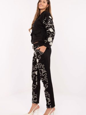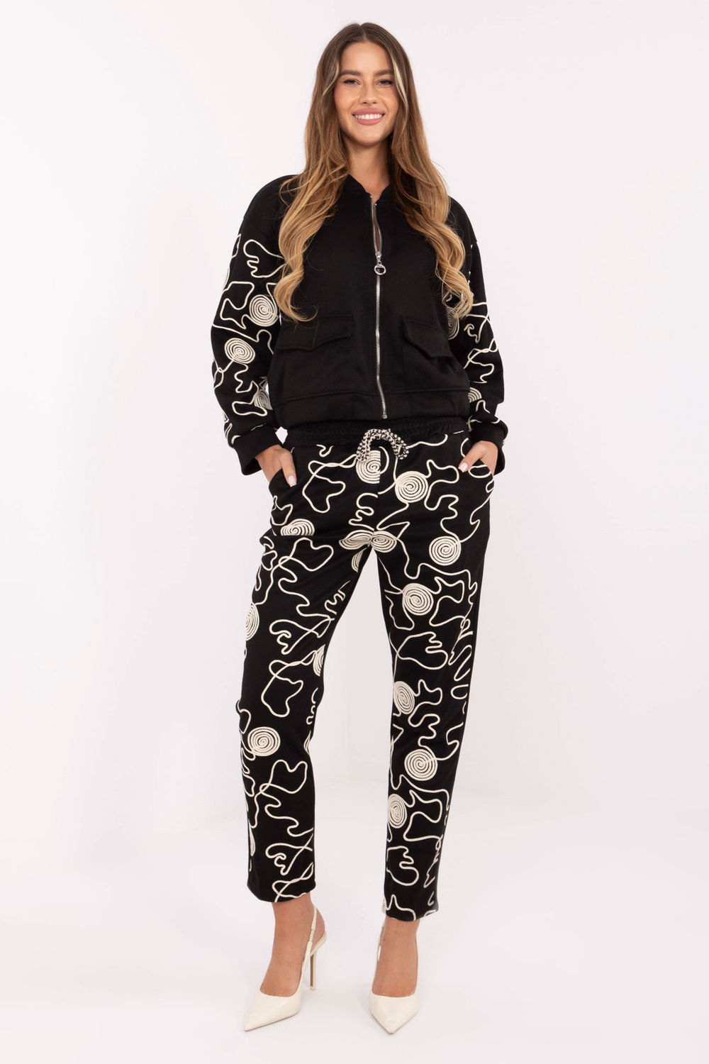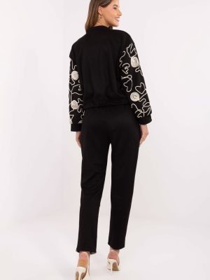 Στυλάτη και άνετη γυναικεία φόρμα αποτελούμενη από μπλούζα με φερμουάρ και παντελόνι με κορδόνι στη μέση. Κατασκευασμένη από υψηλής ποιότητας μείγμα βισκόζης και πολυεστέρα, προσφέρει απαλότητα, ελαστικότητα και άνεση κατά τη διάρκεια της ημέρας. Η μπλούζα έχει casual σχήμα με ψηλό λαιμό, μακρυά μανίκια και τσέπες με καπάκι μπροστά, που προσθέτουν χαρακτήρα και πρακτικότητα. Τα παντελόνια διαθέτουν ψηλή μέση, στενά πόδια και πλευρικές τσέπες, προσφέροντας άνεση και μοντέρνα εμφάνιση. Το σύνολο συμπληρώνουν διακοσμητικά κεντήματα που τοποθετούνται στα μανίκια της μπλούζας και στο μπροστινό μέρος των παντελονιών, δίνοντας στο σετ έναν ξεχωριστό, στυλάτο χαρακτήρα. Αυτή η casual συλλογή είναι η ιδανική επιλογή για καθημερινές στυλιστικές προτάσεις, συνδυάζοντας άνεση, μοντέρνο σχέδιο και γυναικεία λεπτομέρεια.