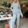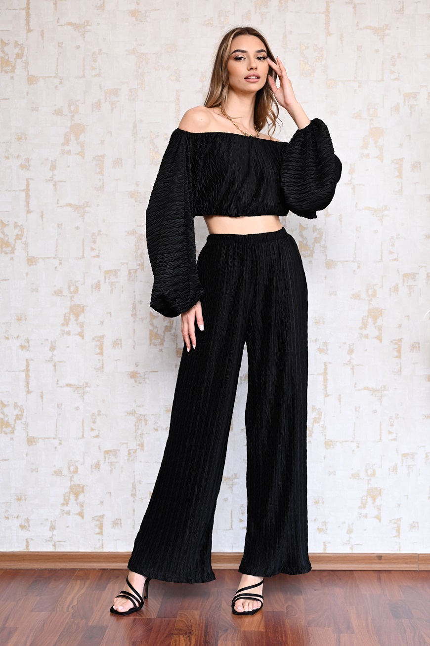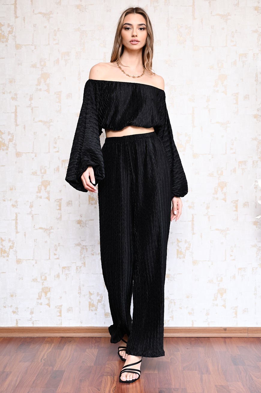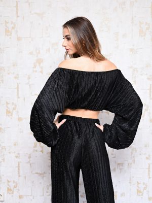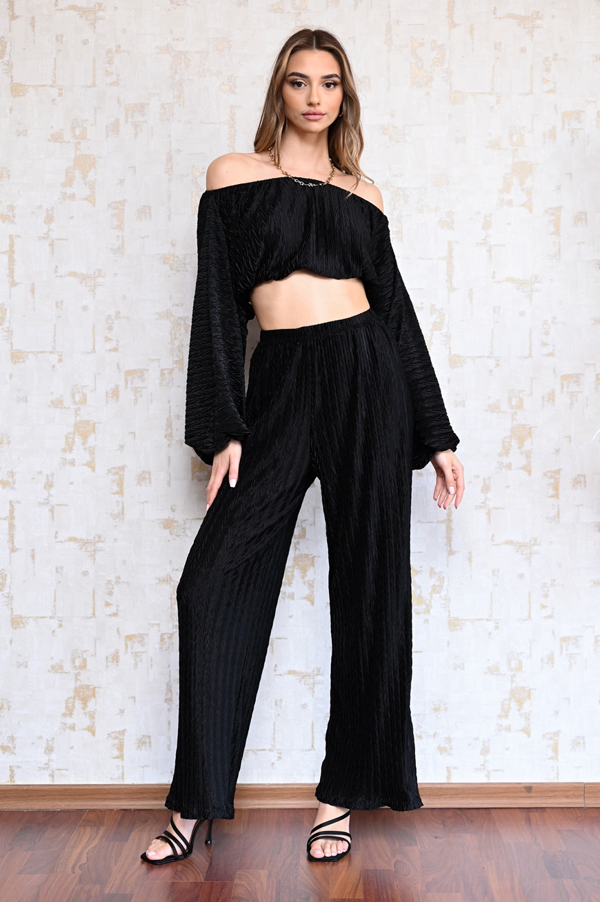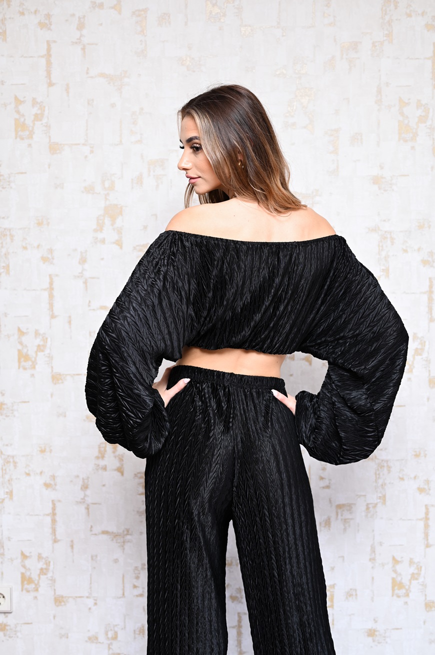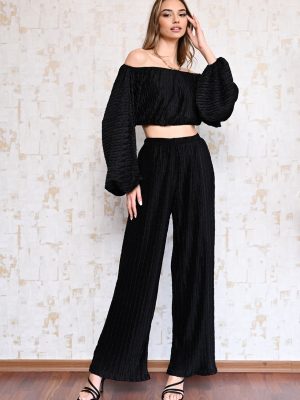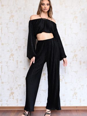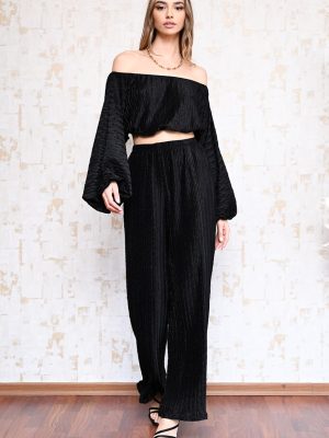 Σετ πλισέ σε μαύρο χρώμα που αποτελείται από τοπ με μακρύ μανίκι με λάστιχο στους ώμους και στο τελείωμα στα μανίκια και παντελόνα με λάστιχο στη μέση. Άνετη γραμμή