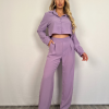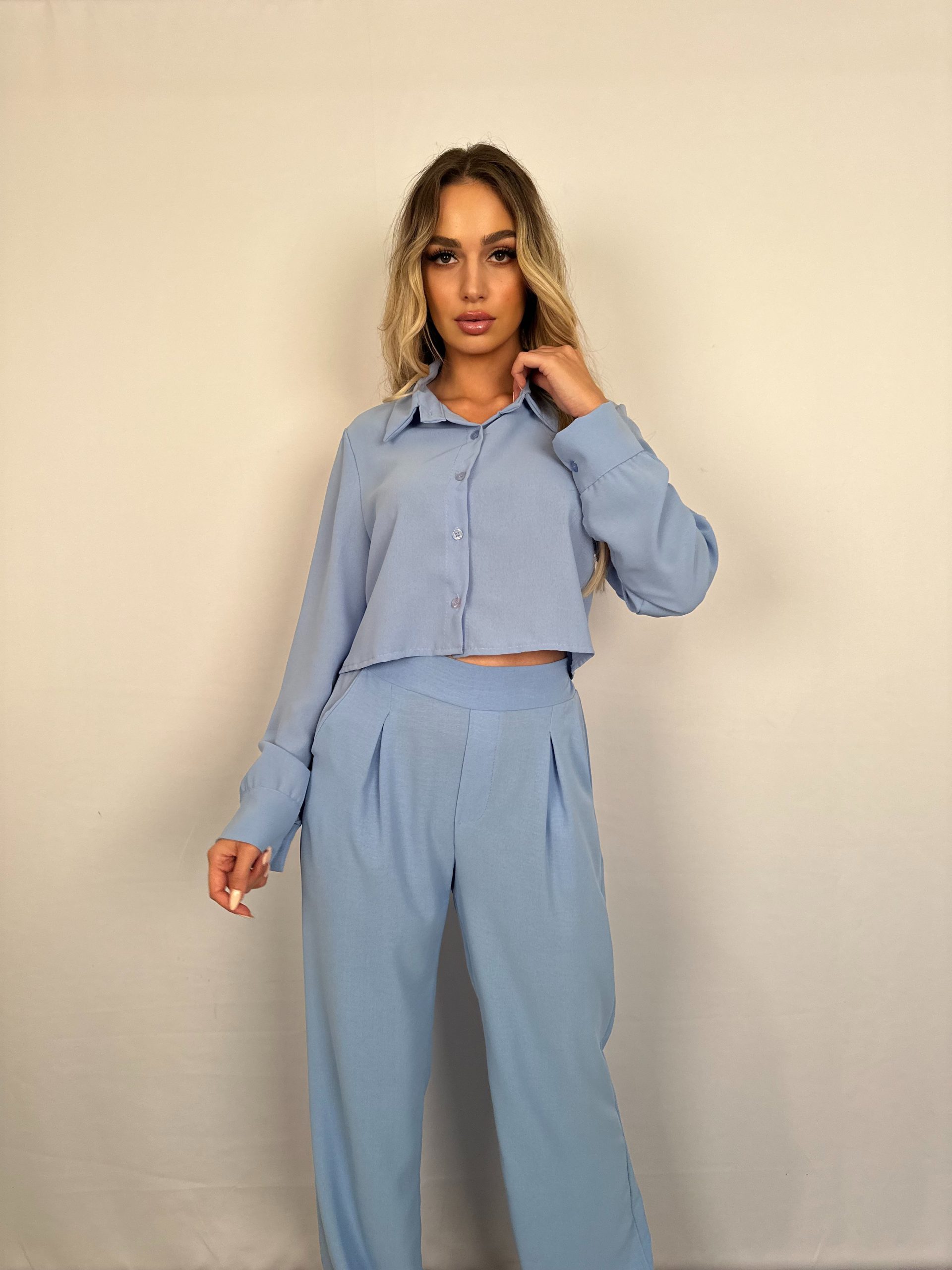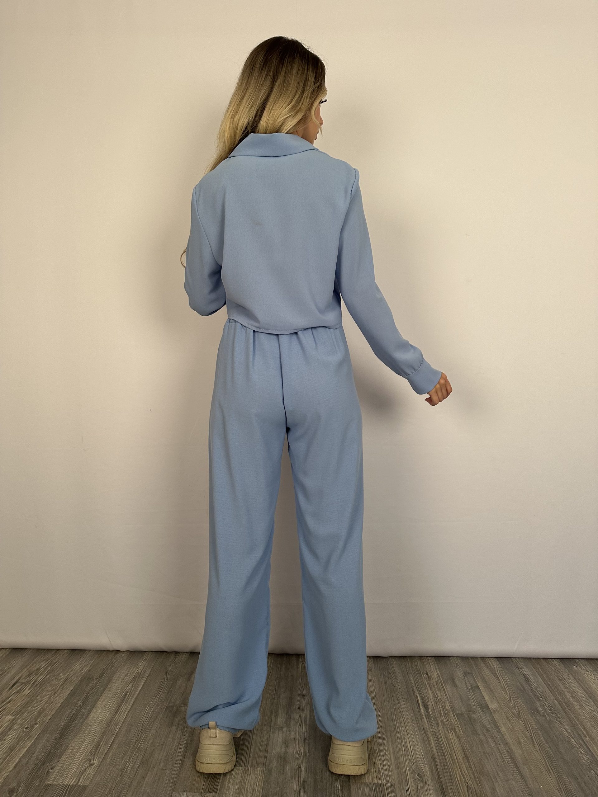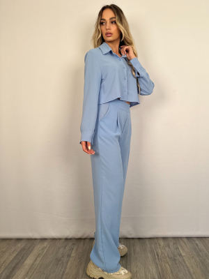 Σετ σε γαλάζιο χρώμα, με πουκάμισο crop με κουμπάκια και παντελόνα με τσέπες και λάστιχο στη μέση στο πίσω μέρος