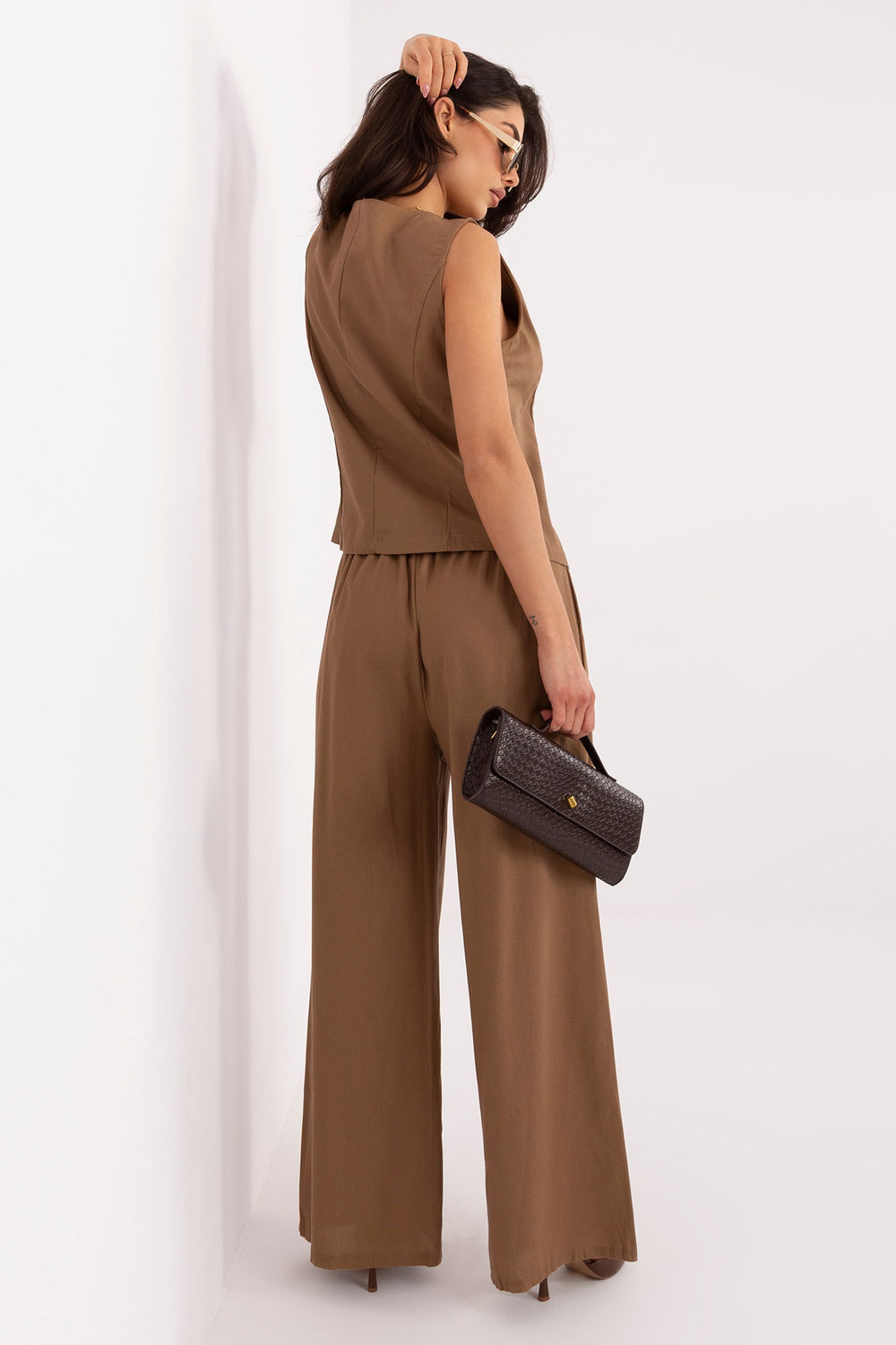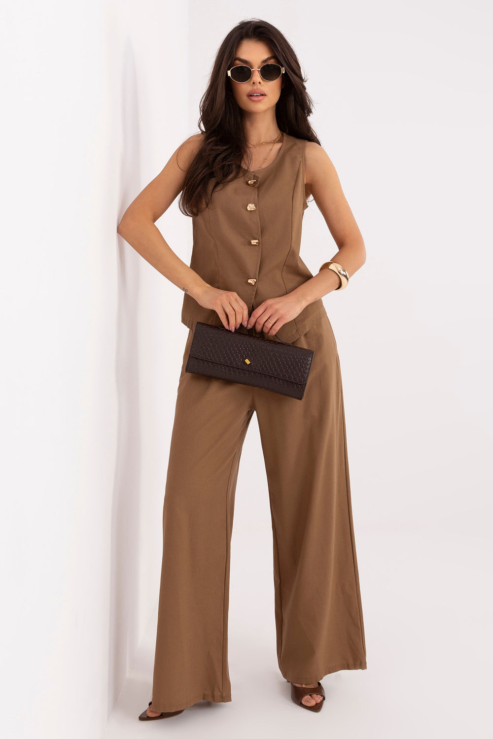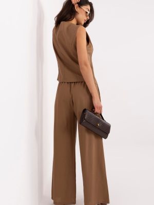 Το γυναικείο σύνολο που αποτελείται από γιλέκο και παντελόνι είναι μια κομψή αλλά ταυτόχρονα άνετη πρόταση, ιδανική για καθημερινή χρήση καθώς και για τη δουλειά. Διατηρημένο σε απλή στυλιστική γραμμή, παρουσιάζεται μοντέρνα και διαχρονικά, επιτρέποντας τη δημιουργία πολλών στυλάτων συνδυασμών. Το γιλέκο με κλασική γραμμή και στρογγυλή λαιμόκοψη κλείνει με κουμπιά σε μονή γραμμή, προσδίδοντας του τακτοποιημένο, κομψό χαρακτήρα. Ιδανικά μπορεί να φορεθεί μόνο του ή σε συνδυασμό με πουκάμισο ή τοπ. Τα παντελόνια με μακριά, φαρδιά μπατζάκια εξασφαλίζουν άνεση και ελευθερία κινήσεων, ταυτόχρονα ακολουθώντας τις τρέχουσες τάσεις. Ο ενσωματωμένος ελαστικός ιμάντας στη μέση εγγυάται άνετη εφαρμογή στο σώμα, ενώ οι πλαϊνές τσέπες αύξαναν τη λειτουργικότητα του μοντέλου. Το σύνολο, κατασκευασμένο από φυσικό μείγμα βαμβακιού και λινών, είναι αεράτο, ελαφρύ και ευχάριστο στη φόρεμα, εξασφαλίζοντας ότι θα είναι ιδανικό για πιο ζεστές ημέρες. Είναι μια στυλάτη και πρακτική πρόταση για γυναίκες που εκτιμούν την κομψότητα στην καθημερινή τους εμφάνιση.