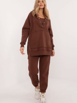 Ένα μονωμένο γυναικείο σετ casual στυλ, ιδανικό για τις πιο κρύες ημέρες και τις καθημερινές εξόδους, αποτελείται από ένα T-shirt, ένα φούτερ και ένα παντελόνι. Το σετ διακρίνεται από ένα μελανζέ μοτίβο που προσθέτει μια μοναδική πινελιά. Κατασκευασμένο κυρίως από βαμβάκι, προσφέρει άνεση και ζεστασιά, ιδανικό για τις φθινοπωρινές και χειμερινές ημέρες. Το παντελόνι έχει μακριά πόδια με ραβδωτά τελειώματα και ψηλή γραμμή που τονίζει τη σιλουέτα και εγγυάται άνετη εφαρμογή. Υπάρχει μέση με κορδόνι για τέλεια εφαρμογή, ενώ οι πλαϊνές τσέπες που μπαίνουν στο παντελόνι είναι μια πρακτική λύση για μικρά αντικείμενα. Το μακρυμάνικο φούτερ κλείνει στη μέση με πιέτες, γεγονός που προσθέτει πρωτοτυπία και καθιστά εύκολη τη χρήση του. Διαθέτει επίσης κουκούλα και μια μεγάλη τσέπη καγκουρό, η οποία προσθέτει μια σπορ πινελιά και επιπλέον λειτουργικότητα. Ολοκληρώνεται με ένα κλασικό T-shirt, δημιουργώντας ένα άνετο και κομψό σύνολο, ιδανικό για καθημερινό styling τις πιο κρύες μέρες.