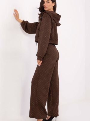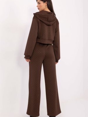 Το στυλάτο και άνετο γυναικείο σετ φόρμας είναι ο ιδανικός συνδυασμός κομψότητας και άνεσης για καθημερινή χρήση. Το σετ αποτελείται από μπλούζα με φερμουάρ και κουκούλα καθώς και παντελόνια με ελαστική μέση, δημιουργώντας μια μοντέρνα και ταυτόχρονα πρακτική σύνθεση. Το μοντέλο έχει κατασκευαστεί από υψηλής ποιότητας μείγμα βισκόζης και πολυεστέρα με ποικιλία υφής, που κοσμεί υπέροχα το σώμα και εξασφαλίζει άνεση κατά την χρήση. Ολόκληρη η επιφάνεια διακοσμείται με εντυπωσιακή εφαρμογή από στρας, προσδίδοντας στο σετ έναν κομψό χαρακτήρα και λεπτή λάμψη. Τα παντελόνια με ψηλή μέση, φαρδιές, μακριές μποτίνες και πλευρικές, εισερχόμενες τσέπες εγγυώνται άνεση και ελευθερία κινήσεων. Η μπλούζα με μακριά μανίκια ολοκληρώνει άψογα το σύνολο, κάνοντάς το ιδανικό για καθημερινές στυλιστικές επιλογές, από χαλαρές εξόδους έως συναντήσεις σε κομψό, αστικό στυλ. Αυτό το σετ είναι ο συνδυασμός άνεσης φόρμας και εκλεπτυσμένης εμφάνισης, που θα σας επιτρέψει να δείχνετε μοντέρνα και να νιώθετε άνετα σε κάθε κατάσταση.
