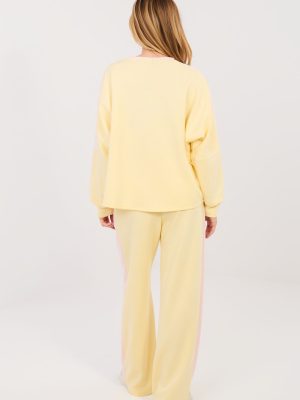 Ο γυναικείος σετ φόρμας που αποτελείται από φούτερ και παντελόνι είναι μια άνετη και κομψή πρόταση για καθημερινές εμφανίσεις σε casual στυλ. Το μοντέλο είναι ιδανικό τόσο για καθημερινή χρήση όσο και κατά τη διάρκεια περιπάτων ή χαλάρωσης, συνδυάζοντας τη μοντέρνα εμφάνιση με τη μέγιστη άνεση κατά τη διάρκεια της χρήσης. Οι διακοσμητικές επιγραφές και οι αριθμοί που έχουν τοποθετηθεί στο μπροστινό μέρος του φούτερ και στα μανίκια προσδίδουν συνολικά έναν αθλητικό, σύγχρονο χαρακτήρα. Το σετ είναι κατασκευασμένο από υψηλής ποιότητας μίγμα πολυεστέρα, βισκόζης και ελαστάνης, που εξασφαλίζει μαλακή υφή, ευελιξία και καλή εφαρμογή στη σιλουέτα. Το φούτερ διαθέτει μακριά μανίκια και κλασικό, στρογγυλό ντεκολτέ. Το παντελόνι με μακριές, φαρδιές ρεβέρ και ψηλή μέση εξασφαλίζει άνεση και ελευθερία κινήσεων. Οι πρακτικές, πλαϊνές τσέπες αυξάνουν τη λειτουργικότητα του σετ. Ένα επιπλέον πλεονέκτημα είναι οι λωρίδες στα ρεβέρ και στα μανίκια που αναδεικνύουν το αθλητικό στυλ και οπτικά λεπταίνουν τη σιλουέτα.