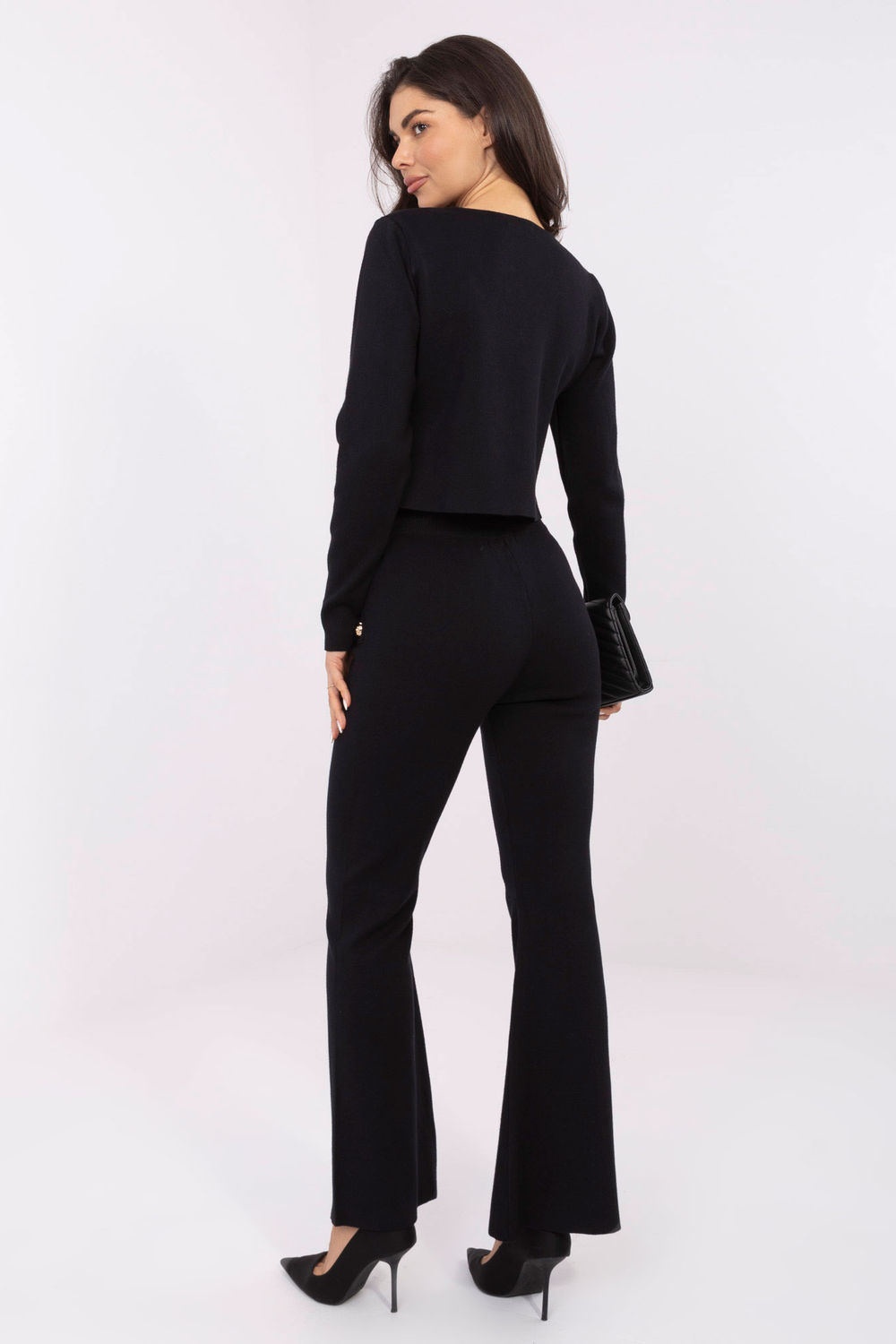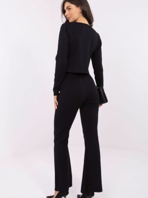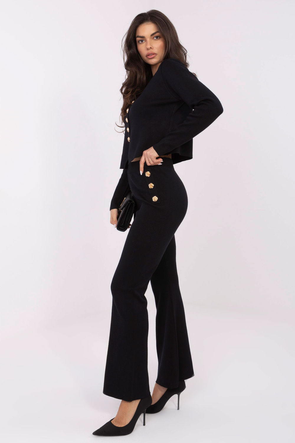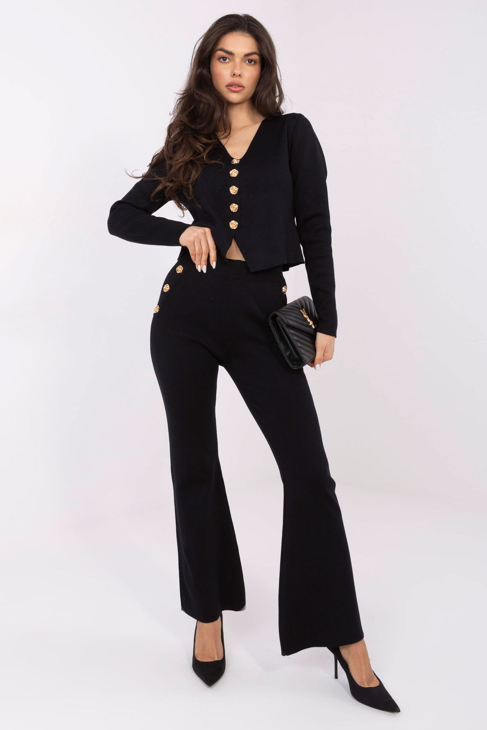 Το γυναικείο σύνολο που αποτελείται από πουλόβερ και παντελόνι είναι μια κομψή πρόταση για γυναίκες που εκτιμούν την πολυτέλεια και την άνεση στις καθημερινές τους εμφανίσεις. Κατασκευασμένο από μαλακό μείγμα βισκόζης και πολυεστέρα, εντυπωσιάζει με την ομαλή υφή του και την ευχάριστη αίσθηση που προσφέρει. Το πουλόβερ με κουμπιά και V-decollete αναδεικνύει διακριτικά τον γυναικείο χαρακτήρα, ενώ το παντελόνι με ψηλή μέση και φαρδιές πόρτες εξασφαλίζει άνεση και κομψή εμφάνιση. Η ραμμένη ελαστικότητα στη μέση εξασφαλίζει ιδανική προσαρμογή, ενώ τα διακοσμητικά κουμπιά στην άνω πλευρά του παντελονιού προσθέτουν μια κομψή αίσθηση στο σύνολο. Το σύνολο είναι ιδανικό τόσο για καθημερινές εμφανίσεις και για δουλειά όσο και για πιο εκλεπτυσμένες στυλιστικές επιλογές.