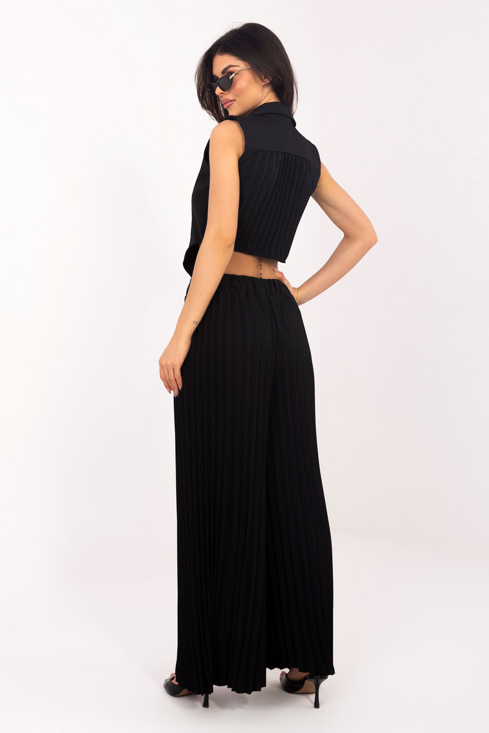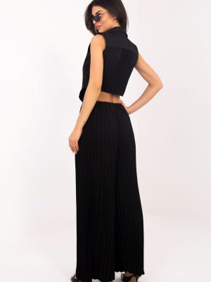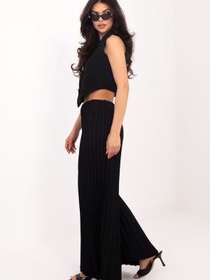 Το γυναικείο σετ που αποτελείται από γιλέκο και παντελόνι είναι μια κομψή και πολυδιάστατη πρόταση, που θα αποδειχθεί χρήσιμη τόσο σε καθημερινές εμφανίσεις, όσο και στη δουλειά, καθώς και σε επίσημες περιστάσεις ή εκδηλώσεις. Ο συνδυασμός κλασικής γραμμής με μοντέρνα κοπή δημιουργεί ένα σύνολο άνετο, αλλά ταυτόχρονα στιλάτο. Το παντελόνι με τις μακρές, φαρδιές ποδιές είναι κατασκευασμένο από μίγμα πολυεστέρα, βισκόζης και ελαστάνης, που εξασφαλίζει άνεση κατά τη διάρκεια της χρήσης, ελαφρότητα και λεπτή ελαστικότητα. Οι πτυχώσεις σε όλο το μήκος και η ελαστική ζώνη στη μέση εξασφαλίζουν άνετη εφαρμογή στο σώμα και ελευθερία κινήσεων. Το διπλό γιλέκο χωρίς μανίκια είναι τελειωμένο με γιακά και κουμπώνει με κουμπιά, ενώ οι λεπτές πτυχώσεις στην πλάτη προσθέτουν κομψότητα και πρωτότυπο χαρακτήρα. Το λεία σχέδιο όλου του σετ του προσδίδει πολυδιάστατη χρηστικότητα και διαχρονικό στυλ. Αυτό είναι το ιδανικό σύνολο για γυναίκες που εκτιμούν την κομψότητα, την ομορφιά και τον μοντέρνο σχεδιασμό, που εφαρμόζεται σε πολλές καταστάσεις από τη δουλειά, μέχρι κοινωνικές συναντήσεις, έως πιο επίσημες περιστάσεις.