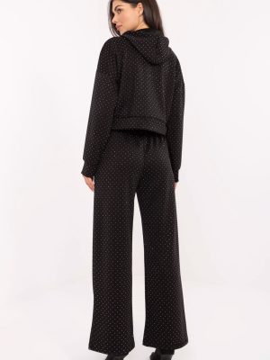 Αυτό το γυναικείο σετ φόρμας συνδυάζει την κομψότητα και την άνεση, ιδανικό για καθημερινές casual στυλιστικές επιλογές. Το σετ αποτελείται από μπλούζα με κουκούλα και κορδόνια, καθώς και παντελόνι με ψηλή μέση και ραμμένο λάστιχο στη μέση, δημιουργώντας μια άνετη και στυλάτη εμφάνιση. Κατασκευασμένο από μείγμα βισκόζης και πολυεστέρα, το σετ είναι ευχάριστο στην αφή, ελαστικό και προσφέρει ελευθερία κινήσεων. Ολόκληρη η επιφάνεια του υφάσματος διακοσμείται με εντυπωσιακή εφαρμογή από στρας, που προσθέτει μια υποτονική λάμψη και κομψότητα στο σετ. Τα παντελόνια με φαρδιές, μακριές καμπάνες και πλάγιες, εισερχόμενες τσέπες αυξάνουν την άνεση χρήσης, ενώ τα μακριά μανίκια της μπλούζας και η κουκούλα με κορδόνια συμπληρώνουν τον λειτουργικό σχεδιασμό. Είναι η ιδανική επιλογή για γυναίκες που θέλουν να συνδυάσουν την άνεση της φόρμας με μια κομψή εμφάνιση στις καθημερινές τους στυλιστικές επιλογές.