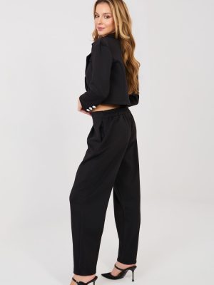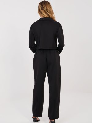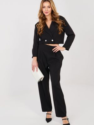Μια κομψή γυναικεία συλλογή που αποτελείται από ένα κοντό σακάκι και μακριά παντελόνια είναι μια εξαιρετική πρόταση για τη δουλειά και την καθημερινότητα. Το κλασικό, μονόχρωμο σχέδιο αναδεικνύει τον διαχρονικό χαρακτήρα του συνόλου, ενώ το προσεκτικά επιλεγμένο ύφασμα (πολυεστέρας, βισκόζη, ελαστάνη) εξασφαλίζει άνεση, ανθεκτικότητα και αισθητική εμφάνιση καθ’ όλη τη διάρκεια της ημέρας. Το κοντό σακάκι με μακριά μανίκια έχει φινίρισμα με πέτο που προσφέρει κομψότητα και επαγγελματικό χαρακτήρα. Η διπλή κουμπώσει προσθέτει κομψότητα και διαγράφει διακριτικά τη σιλουέτα. Τα παντελόνια με ψηλή μέση αναδεικνύουν όμορφα τη μέση, ενώ οι στενές γραμμές τους κάνουν τα πόδια να φαίνονται πιο ψηλά. Το μοντέλο δεν διαθέτει κλασικό κούμπωμα, αλλά έχει ραμμένη ελαστική ταινία στη μέση, που εγγυάται άνεση κατά τη διάρκεια της χρήσης και τέλεια εφαρμογή. Επιπλέον πλεονέκτημα είναι οι πρακτικές, πλαϊνές τσέπες. Το ύφασμα είναι μαλακό, λεπτό και εξαιρετικά ευχάριστο στην αφή. Αυτή η πολυδιάστατη συλλογή συνδυάζει την κομψότητα με την άνεση, ιδανική για το γραφείο, επιχειρηματικές συναντήσεις και στιλάτες καθημερινές εξόδους.