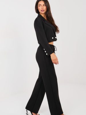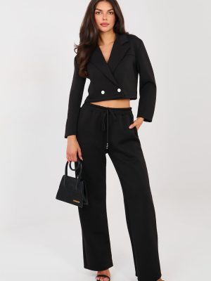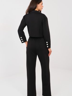 Στυλάτη ολοκληρωμένη φόρμα: σακάκι συν παντελόνι, που συνδυάζει την κομψότητα με την καθημερινή άνεση. Ραμμένο από υλικό τύπου βούτυρο, εξαιρετικά ευχάριστο στην αφή, μαλακό, λεπτό και ομαλό, προσφέρει τη μέγιστη άνεση φόρεσης και εξαιρετική προσαρμογή στη σιλουέτα. Το σακάκι με πέτα και γιακά, κλείνει με κουμπιά, δίνει σε όλο το σύνολο μια σύγχρονη, casual αίσθηση. Το μακρύ μανίκι με διακοσμητικά κουμπιά αποτελεί μια στιλάτη λεπτομέρεια που υπογραμμίζει την προσεγμένη εκτέλεση. Το παντελόνι με ψηλή μέση, μακριές, ίσιες γραμμές και ζώνη που δένεται εξασφαλίζει άνεση και ελευθερία κινήσεων. Το μοντέλο διαθέτει πλευρικές, κρυφές τσέπες που αυξάνουν τη λειτουργικότητα του συνόλου. Το λείο σχέδιο και το προσεκτικά επιλεγμένο μείγμα πολυεστέρα, βισκόζης και ελαστάνης εξασφαλίζουν ότι το σύνολο ταιριάζει τέλεια τόσο σε καθημερινές στυλιστικές επιλογές όσο και για δουλειά σε μια κομψή, άνετη εκδοχή. Είναι η ιδανική πρόταση για γυναίκες που εκτιμούν το στυλ, την άνεση και την ευχρηστία σε ένα σύνολο.