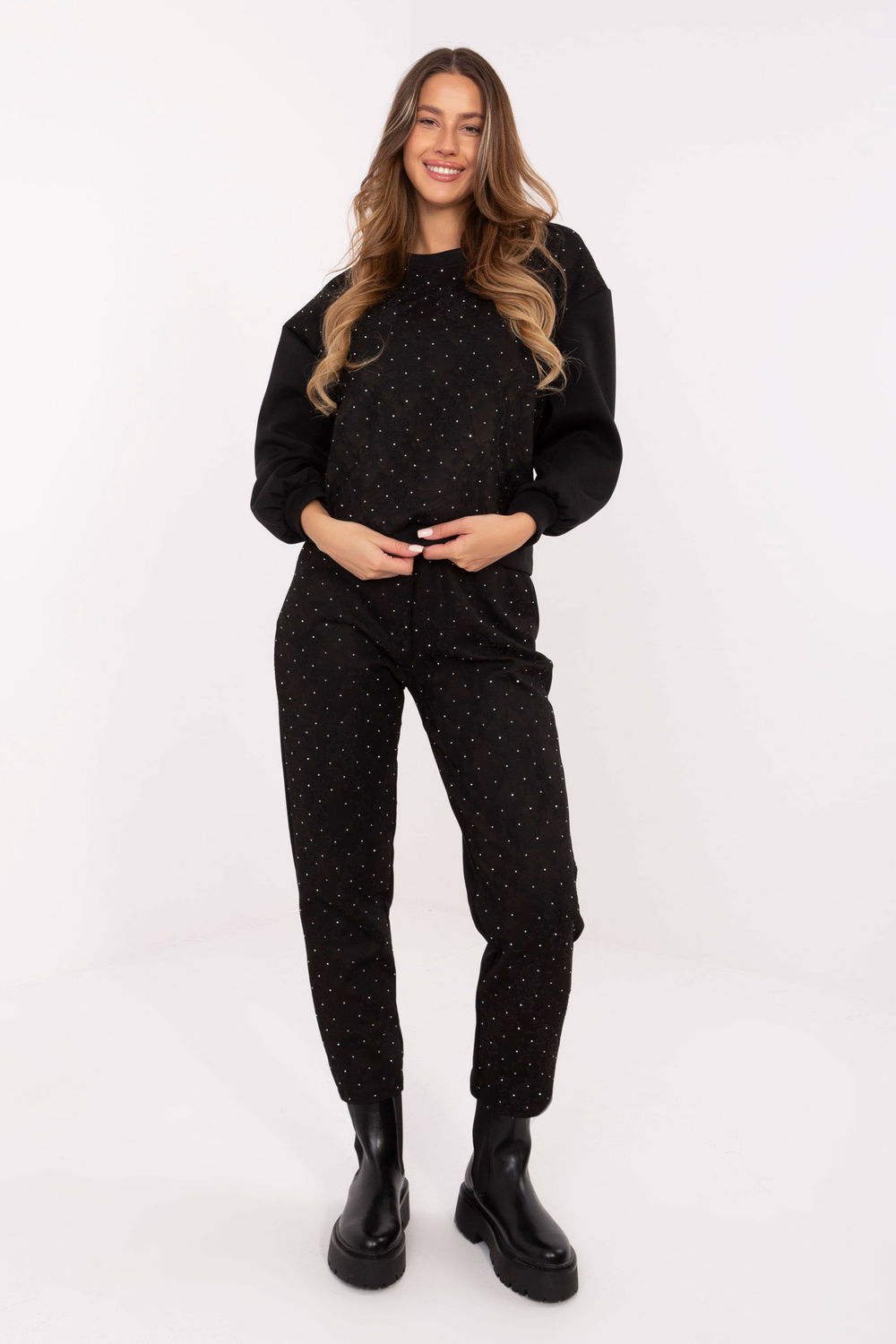 Το στιλάτο γυναικείο σετ φόρμας που αποτελείται από φούτερ και παντελόνι είναι η ιδανική πρόταση σε casual εμφάνιση, τέλεια για καθημερινές στυλιστικές επιλογές και άνετη χρήση στο σπίτι ή στην πόλη. Το μοντέλο με τις εφαρμογές στη μπροστινή πλευρά του φούτερ και του παντελονιού (εκτός από τα μανίκια) τραβά την προσοχή, ενώ ο συνδυασμός δαντέλας και στρας προσδίδει στο σετ μια μοντέρνα, γυναικεία αίσθηση. Το φούτερ με στρογγυλή λαιμόκοψη και μακριά μανίκια εξασφαλίζει άνεση και ελευθερία κινήσεων. Το παντελόνι έχει ψηλή μέση και μακριά, στενη παντελόνα, που προσφέρει άνεση και αναδεικνύει τη σιλουέτα. Οι πλευρικές τσέπες προσθέτουν πρακτικότητα, ενώ το σύνολο είναι φτιαγμένο από ευχάριστο στην αφή μείγμα βισκόζης και ελαστάνης, που εξασφαλίζει ελαστικότητα και αντοχή του υλικού. Αυτό το σετ είναι η τέλεια επιλογή για γυναίκες που εκτιμούν την άνεση, την κομψή εμφάνιση και τις διακριτικές, κομψές λεπτομέρειες στις καθημερινές τους στυλιστικές επιλογές. Το υλικό είναι απαλό, μαλακό και εξαιρετικά ευχάριστο στην αφή.