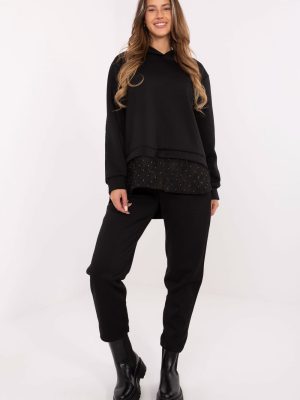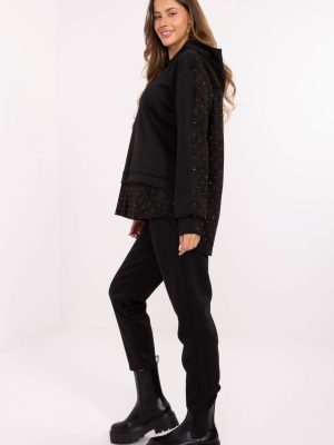Μοντέρνο και άνετο γυναικείο σετ σε casual στυλ, ιδανικό για καθημερινή χρήση. Κατασκευασμένο από υψηλής ποιότητας μείγμα βισκόζης και ελαστάνης, είναι ελαστικό, αεριζόμενο και εξαιρετικά ευχάριστο στην αφή, προσφέροντας μέγιστη άνεση κατά την περίοδο χρήσης. Το σετ περιλαμβάνει μια μπλούζα με κουκούλα και παντελόνι με μακριά, στενά μπατζάκια. Η μπλούζα ξεχωρίζει με τη διακοσμητική εφαρμογή από στρασάκια και δαντελένιες ενθέσεις στην πλάτη, την πίσω πλευρά των μανικιών και στο κάτω μέρος μπροστά, προσδίδοντας στο σύνολο μια κομψή αίσθηση. Τα παντελόνια διαθέτουν ενσωματωμένο λάστιχο στη μέση και πλαϊνές, ανοιχτές τσέπες, κάνοντάς τα ταυτόχρονα άνετα και πρακτικά. Είναι ένα εξαιρετικό σύνολο για γυναίκες που εκτιμούν τον συνδυασμό άνεσης, θηλυκότητας και μοντέρνων λεπτομερειών, ιδανικό για καθημερινές στυλιστικές επιλογές, περιπάτους ή συναντήσεις με φίλους.
