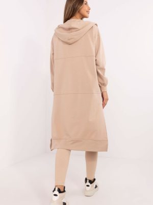 Το γυναικείο σετ που αποτελείται από φούτερ, μπλούζα και κολάν είναι ένας αρμονικός συνδυασμός casual και σπορ στυλ. Δημιουργημένο για καθημερινή άνεση και δραστηριότητα, είναι ιδανικό τόσο για προπόνηση όσο και για χαλάρωση. Το φούτερ με το εκτεταμένο κόψιμο αποτελεί μια πρακτική λύση για τις πιο κρύες ημέρες. Με φερμουάρ και εξοπλισμένη με ολισθηρές τσέπες, προσφέρει άνεση και λειτουργικότητα. Κατασκευασμένη από μείγμα βαμβακιού, πολυεστέρα και ελαστάνης, συνδυάζει την απαλότητα με την ελαστικότητα. Το μακρύ μανίκι και η κουκούλα προστατεύουν περαιτέρω από τον αέρα και το κρύο. Η μπλούζα με στρογγυλή λαιμόκοψη είναι απλή αλλά ευέλικτη, ταιριάζοντας απόλυτα με ολόκληρο το σύνολο. Η σύνθεσή της από βαμβάκι και ελαστάνη εγγυάται αναπνοή και άνεση στη χρήση. Το κολάν με τα κωνικά πόδια και την ψηλή μέση τονίζει τη σιλουέτα, ενώ επιτρέπει πλήρη ελευθερία κινήσεων. Κατασκευασμένο από βαμβάκι και ελαστάνη, χαρακτηρίζεται από ελαστικότητα και ανθεκτικότητα. Η ραβδωτή δομή του υφάσματος τους προσδίδει έναν μοναδικό χαρακτήρα. Ο συνολικός σχεδιασμός, ο οποίος διατηρείται σε ομαλό μοτίβο, ταιριάζει απόλυτα με την καθημερινή σπορ εμφάνιση, προσφέροντας ταυτόχρονα στυλ και μέγιστη άνεση.