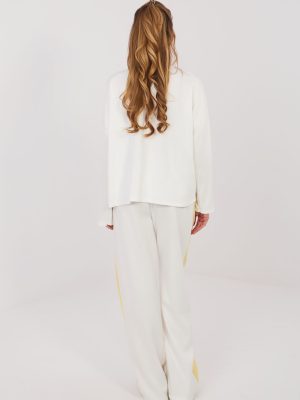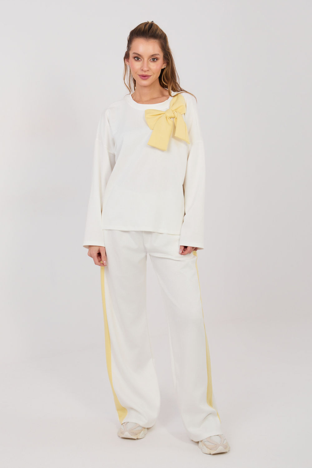 Το κομψό γυναικείο σετ φόρμας σε casual στυλ είναι μια ιδανική πρόταση για καθημερινή χρήση. Ο συνδυασμός άνεσης με μοντέρνες λεπτομέρειες καθιστά το σετ ιδανικό για καθημερινές δραστηριότητες, περιπάτους ή συναντήσεις σε χαλαρό στυλ. Το σετ αποτελείται από μια μπλούζα με μακριά μανίκια και κλασικό, στρογγυλό ντεκολτέ, καθώς και μακριά παντελόνια με φαρδιές ποδιές. Το απλό μοτίβο αναδεικνύει τον καθολικό χαρακτήρα του σετ, διευκολύνοντας την προσαρμογή του σε διάφορες αξεσουάρ. Η μπλούζα είναι διακοσμημένη με μια εντυπωσιακή αντίθετη κορδέλα μπροστά, που προσθέτει στην συνολική εμφάνιση μια θηλυκή και διακριτικά κομψή νότα. Τα παντελόνια με υψηλή μέση τονίζουν όμορφα τη μέση, ενώ η ελαστική ζώνη που είναι ραμμένη στη μέση προσφέρει άνετη εφαρμογή στη σιλουέτα. Ένα επιπλέον πλεονέκτημα είναι οι πρακτικές πλαϊνές τσέπες και οι λωρίδες που διατρέχουν τα πόδια, προσδίδοντας αθλητικό χαρακτήρα και οπτικά λεπτύνουν τα πόδια. Το σετ είναι κατασκευασμένο από ευχάριστο στην αφή μείγμα πολυεστέρα, βισκόζης και ελαστάνης, το οποίο είναι μαλακό, ελαστικό και ανθεκτικό σε ζάρες, εξασφαλίζοντας άνεση κατά τη διάρκεια όλης της ημέρας. Είναι ένα άνετο και θηλυκό σετ που συνδυάζει την αθλητική ελευθερία με μοντέρνες λεπτομέρειες.