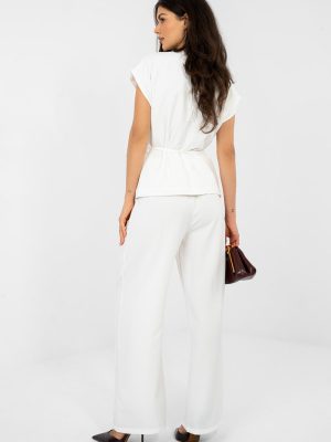 Στυλάτη γυναικεία συλλογή που συνδυάζει την κομψότητα με τον μοντέρνο σχεδιασμό. Το σετ αποτελείται από γιλέκο με κοντά μανίκια και μακριά παν trousers με φαρδιά μπατζάκια, δημιουργώντας μια συνεπή και εντυπωσιακή εμφάνιση ιδανική για το γραφείο, καθημερινές χρήσεις και επίσημες περιστάσεις. Το γιλέκο με τον φάκελο ντεκολτέ αναδεικνύει όμορφα τη γραμμή του λαιμού και οπτικά λεπταίνει τη σιλουέτα. Το μοντέλο κλείνει με κουμπί και στη μέση έχει κορδόνι λεπτού ζωνάρι που επιτρέπει την ατομική προσαρμογή και την τόνωση των γυναικείων καμπυλών. Η λεία υφή δίνει σε όλο το σύνολο μια διαχρονική αίσθηση. Τα παν trousers με ψηλή μέση μοντελοποιούν τέλεια τη σιλουέτα, εξασφαλίζοντας άνεση και κομψή εμφάνιση. Στη μέση έχει ενσωματωμένη ελαστική ζώνη που εγγυάται άνεση στη χρήση και τέλεια εφαρμογή. Τα φαρδιά, μακριά μπατζάκια δίνουν στην εμφάνιση ελαφρότητα και κλάση, ενώ οι πρακτικές πλευρικές τσέπες αυξάνουν τη λειτουργικότητα. Το σετ είναι φτιαγμένο από υψηλής ποιότητας μείγμα πολυεστέρα και βισκόζης, το υλικό είναι ευχάριστο στην αφή, ελαφρώς ελαστικό και κάθεται όμορφα στη σιλουέτα. Είναι η ιδανική πρόταση για γυναίκες που εκτιμούν την κομψότητα, την άνεση και την πολυλειτουργικότητα σε μία εμφάνιση.