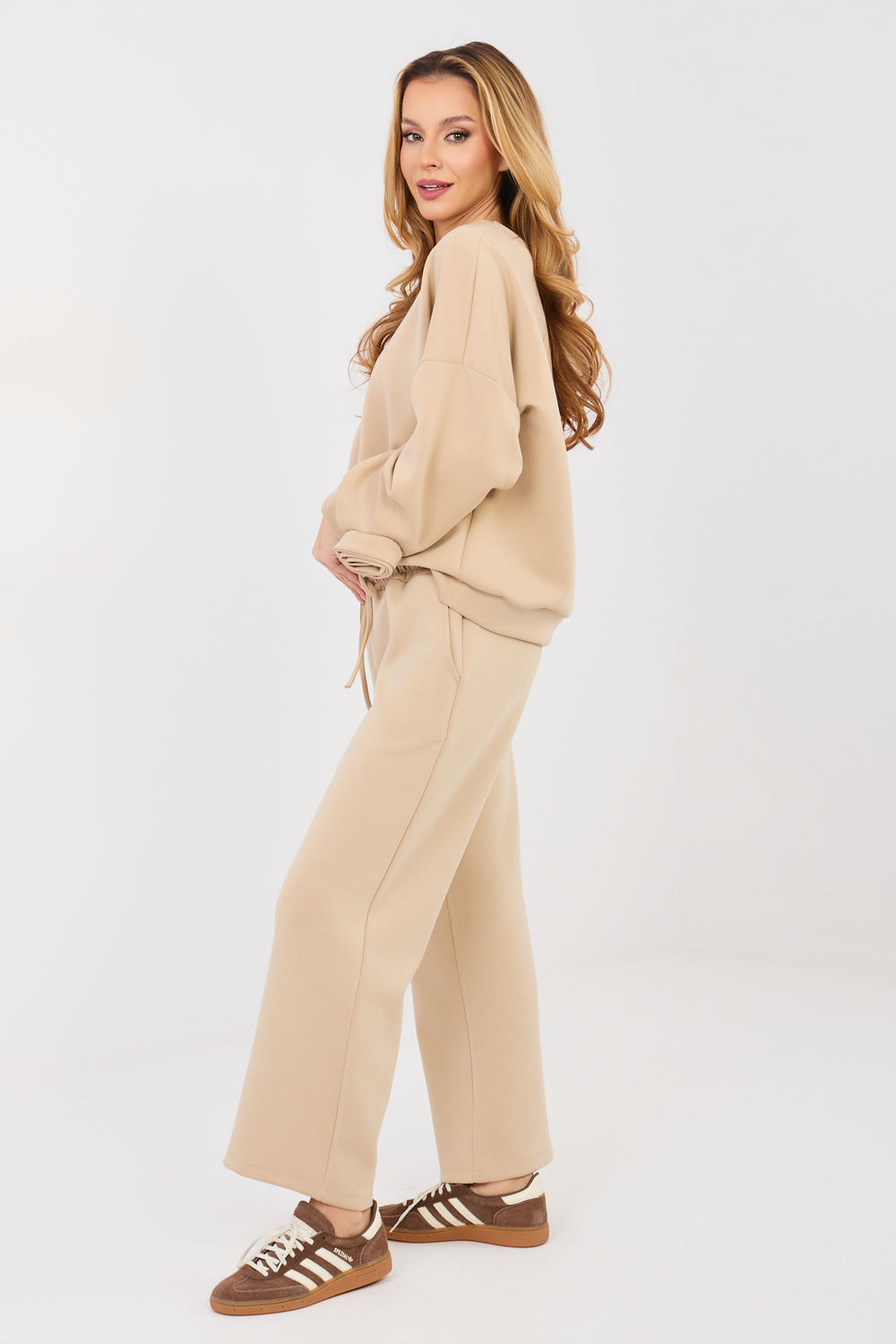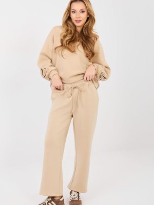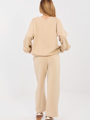 Στυλάτο γυναικείο σετ που αποτελείται από μπλούζα και παντελόνι, ιδανικό για καθημερινές στιλιστικές επιλογές σε casual στυλ. Κατασκευασμένο από μαλακό και ευχάριστο στην αφή βισκόζ, με προσθήκη ελαστάνης, που εξασφαλίζει άνεση κατά τη διάρκεια της ημέρας και ελευθερία κινήσεων. Η μπλούζα με μακριά μήκος διαθέτει στρογγυλή λαιμόκοψη και μακρύ μανίκι, διακοσμημένο με μια διακριτική υφασμάτινη ροζα στο καρπό, που προσθέτει σε όλο το σύνολο μια γυναικεία και πρωτότυπη αίσθηση. Το παντελόνι με ψηλό μέση και ίσια πόδια εγγυάται άνεση και διαχρονική εμφάνιση. Στη μέση χρησιμοποιείται ενσωματωμένο λάστιχο και κορδόνια για να επιτρέπουν τέλεια προσαρμογή στη σιλουέτα. Ένα επιπλέον πλεονέκτημα είναι οι πλαϊνές τσέπες που διευκολύνουν τη λειτουργικότητα του σετ. Η ομαλή σχεδίαση καθιστά το σετ καθολικό και εύκολο στον στιλιζαρισμό, ιδανικό τόσο για βόλτα όσο και για καθημερινή χρήση. Είναι μια πρόταση για γυναίκες που εκτιμούν την άνεση, το στυλ και τις διακριτικές λεπτομέρειες.