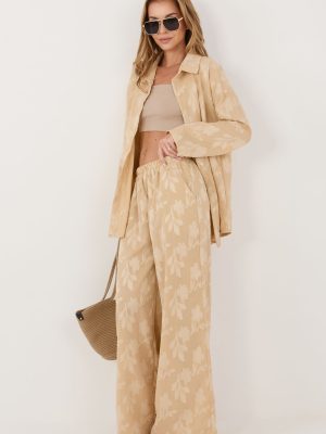 Το γυναικείο σύνολο που αποτελείται από πουκάμισο και παντελόνι είναι μια κομψή και άνετη πρόταση για καθημερινή χρήση. Διακρίνεται για την ποικιλόμορφη υφή του υλικού, που προσδίδει στο σύνολο μια σύγχρονη και πρωτότυπη αίσθηση. Το πουκάμισο με μακριά μανίκια, κλασικό γιακά και κουμπιά παρουσιάζεται κομψό, ενώ ταυτόχρονα άνετο, γεγονός που το καθιστά ιδανικό τόσο για casual όσο και για πιο επίσημες στιλιστικές επιλογές. Τα παντελόνια με μακριά μπατζάκια διαθέτουν ελαστική ζώνη με ραμμένη λάστιχο, η οποία εξασφαλίζει άνετη εφαρμογή στη σιλουέτα και άνεση κατά τη διάρκεια ολόκληρης της ημέρας. Επιπλέον, έχουν πρακτικές πλαϊνές τσέπες. Το σύνολο είναι κατασκευασμένο από μαλακό και ευχάριστο στην αφή μείγμα βισκόζης και ελαστάνης που εγγυάται ελαφρότητα, ελαστικότητα και ελευθερία κινήσεων. Είναι η ιδανική επιλογή για γυναίκες που εκτιμούν την άνεση συνδυασμένη με μοντέρνα εμφάνιση.