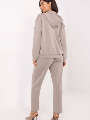 Μια στυλάτη φόρμα που αποτελείται από φούτερ και παντελόνι, ιδανική για καθημερινές, casual εμφανίσεις. Κατασκευασμένη από υψηλής ποιότητας βισκόζη με ποικιλόμορφη υφή, από μαλακό, απαλό και εξαιρετικά ευχάριστο στην αφή ύφασμα, που εγγυάται μέγιστη άνεση κατά τη διάρκεια της χρήσης. Το φούτερ διαθέτει μακριά μανίκια και πρακτική κουκούλα, ενώ το μπροστινό μέρος κοσμεί η διακοσμητική πικέ ραφή, που προσδίδει σε όλο το σύνολο έναν σύγχρονο χαρακτήρα. Το μοντέλο κλείνει με φερμουάρ, αυξάνοντας την άνεση στη χρήση. Στο ύψος του στήθους υπάρχουν τσέπες με παπιγιόν, διακοσμημένες με κομψές καρφίτσες, προσθέτοντας μια διακριτική αυθεντικότητα και στυλάτο φινίρισμα. Το παντελόνι έχει ψηλή μέση, στενές ποδιές και ραμμένη ελαστικότητα στη μέση με επιπλέον κορδόνι, εξασφαλίζοντας ιδανική εφαρμογή και άνεση. Είναι επίσης εξοπλισμένο με πλαϊνές τσέπες με ανοίγματα, γεγονός που το καθιστά πρακτικό για καθημερινή χρήση. Οι ποδιές έχουν μήκος, είναι άνετες και εφαρμόζουν υπέροχα στη σιλουέτα. Το σύνολο εντυπωσιάζει με τον συνδυασμό άνεσης, λειτουργικότητας και μοντέρνων λεπτομέρειων, ιδανικό για γυναίκες που εκτιμούν την στυλάτη εμφάνιση σε casual έκδοση.