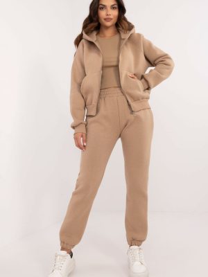 Γυναικείο σετ φόρμας, ιδανικό για καθημερινό casual και σπορ στυλ, κατασκευασμένο από μείγμα βαμβακιού και ελαστάνης. Το σετ αποτελείται από ένα κοντό μπλουζάκι μέχρι τους ώμους, ένα φούτερ με κουκούλα, μακριά μανίκια και τσέπες με φερμουάρ και ένα παντελόνι με μακριά πόδια και μανσέτες με ραβδώσεις. Το παντελόνι έχει ψηλό κόψιμο και πλαϊνές τσέπες για μεγαλύτερη ευκολία. Στο πίσω μέρος του παντελονιού υπάρχει ένα διακριτικό σχέδιο στο ύψος των γλουτών. Ο συνολικός σχεδιασμός διατηρείται σε μελανζέ μοτίβο και η επιπλέον ζεστασιά προσφέρει άνεση τις πιο κρύες ημέρες. Πρόκειται για μια άνετη και κομψή επιλογή για καθημερινή χρήση. .