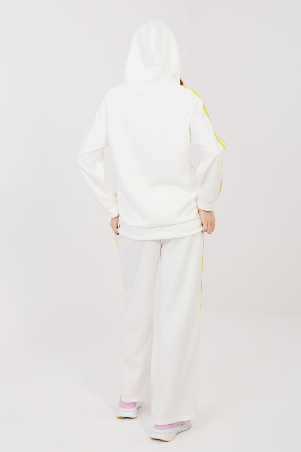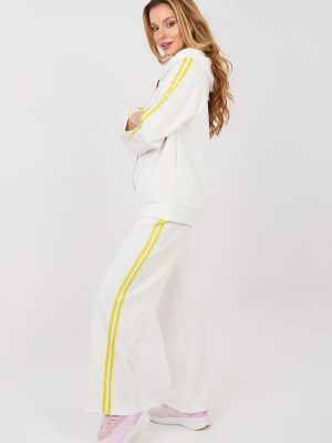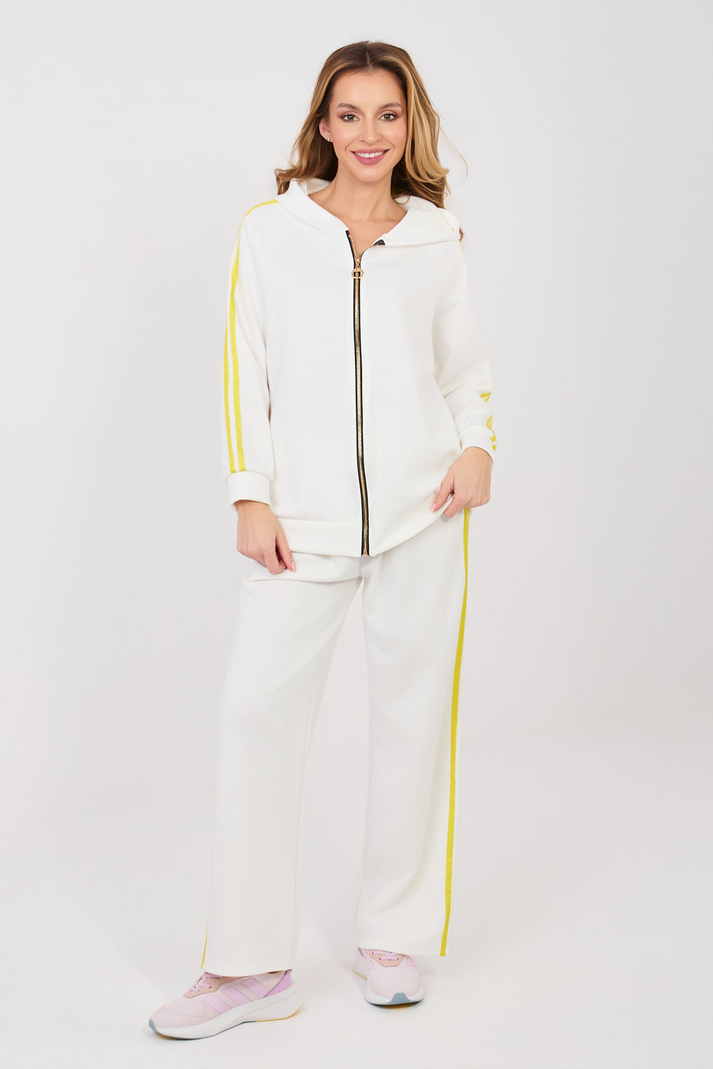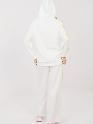 Γυναικείο σετ φόρμας που αποτελείται από φούτερ και παντελόνι, ιδανικό για καθημερινές casual εμφανίσεις. Ο απλός σχεδιασμός καθιστά το σετ μοντέρνο και универсικό, γεγονός που το καθιστά εξαιρετικό για βόλτες, ψώνια ή χαλάρωση. Το σετ έχει κατασκευαστεί από ένα άνετο και ευχάριστο μείγμα πολυεστέρα, ελαστάνης και βισκόζης. Το ύφασμα είναι μαλακό, ελαστικό και προσαρμόζεται καλά στη σιλουέτα, παρέχοντας άνεση όλη την ημέρα. Το φούτερ με μακριά μανίκια διαθέτει πρακτική κουκούλα και φερμουάρ, διευκολύνοντας τη φόρεση και επιτρέποντας την προσαρμογή στις καιρικές συνθήκες. Ένα επιπλέον πλεονέκτημα είναι οι πλαϊνές, εσοχές τσέπες. Τα μανίκια είναι διακοσμημένα με μοντέρνες λωρίδες που προσδίδουν αθλητικό χαρακτήρα. Το παντελόνι έχει ψηλή μέση και μακριά, φαρδιά ποδαράκια που παρέχουν ελευθερία κινήσεων. Στη μέση υπάρχει ελαστική ταινία και κορδόνι που επιτρέπουν καλύτερη εφαρμογή. Οι λωρίδες στα ποδαράκια τονίζουν τον μοντέρνο, αθλητικό-casual στυλ του σετ.