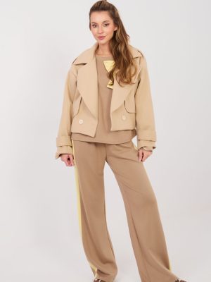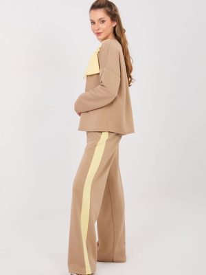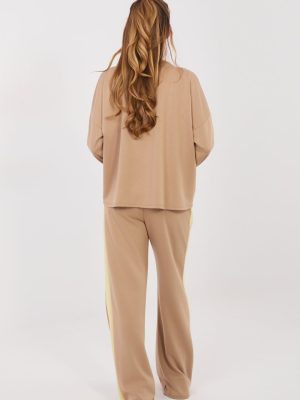 Η στυλάτη γυναικεία φόρμα σε καθημερινή έκδοση είναι η ιδανική πρόταση για κάθε μέρα. Ο συνδυασμός άνεσης και μοντέρνων λεπτομερειών καθιστά το σύνολο ιδανικό για καθημερινές δραστηριότητες, περιπάτους ή συναντήσεις σε χαλαρό στυλ. Το σύνολο αποτελείται από ένα μπλουζάκι με μακριά μανίκια και κλασική, στρογγυλή λαιμόκοψη, καθώς και μακρύ παντελόνι με φαρδιές γάμπες. Το απλό μοτίβο ενισχύει τον καθολικό χαρακτήρα του συνόλου, διευκολύνοντας τη συνδυαστικότητα με διάφορα αξεσουάρ. Το μπλουζάκι έχει διακοσμηθεί με μια εντυπωσιακή αντίθετη κορδέλα μπροστά, που προσθέτει μια γυναικεία και διακριτικά κομψή πινελιά σε όλη την εμφάνιση. Το παντελόνι με ψηλή μέση αναδεικνύει όμορφα τη μέση, ενώ η ραμμένη ελαστική ζώνη στη μέση εξασφαλίζει άνετη εφαρμογή στη σιλουέτα. Ένα επιπλέον πλεονέκτημα είναι οι πρακτικές πλευρικές τσέπες και οι λωρίδες που τρέχουν κατά μήκος των γάμπων, οι οποίες προσθέτουν αθλητικό χαρακτήρα και οπτικά επιμηκύνουν τα πόδια. Το σύνολο είναι φτιαγμένο από ένα ευχάριστο στο άγγιγμα μείγμα από πολυέστερ, βισκόζη και ελαστάνη, το ύφασμα είναι μαλακό, ελαστικό και ανθεκτικό στις ζάρες, διασφαλίζοντας άνεση στο φόρεμα καθόλη τη διάρκεια της ημέρας. Είναι ένα άνετο και γυναικείο σύνολο που συνδυάζει την αθλητική ελευθερία με μοντέρνες λεπτομέρειες.