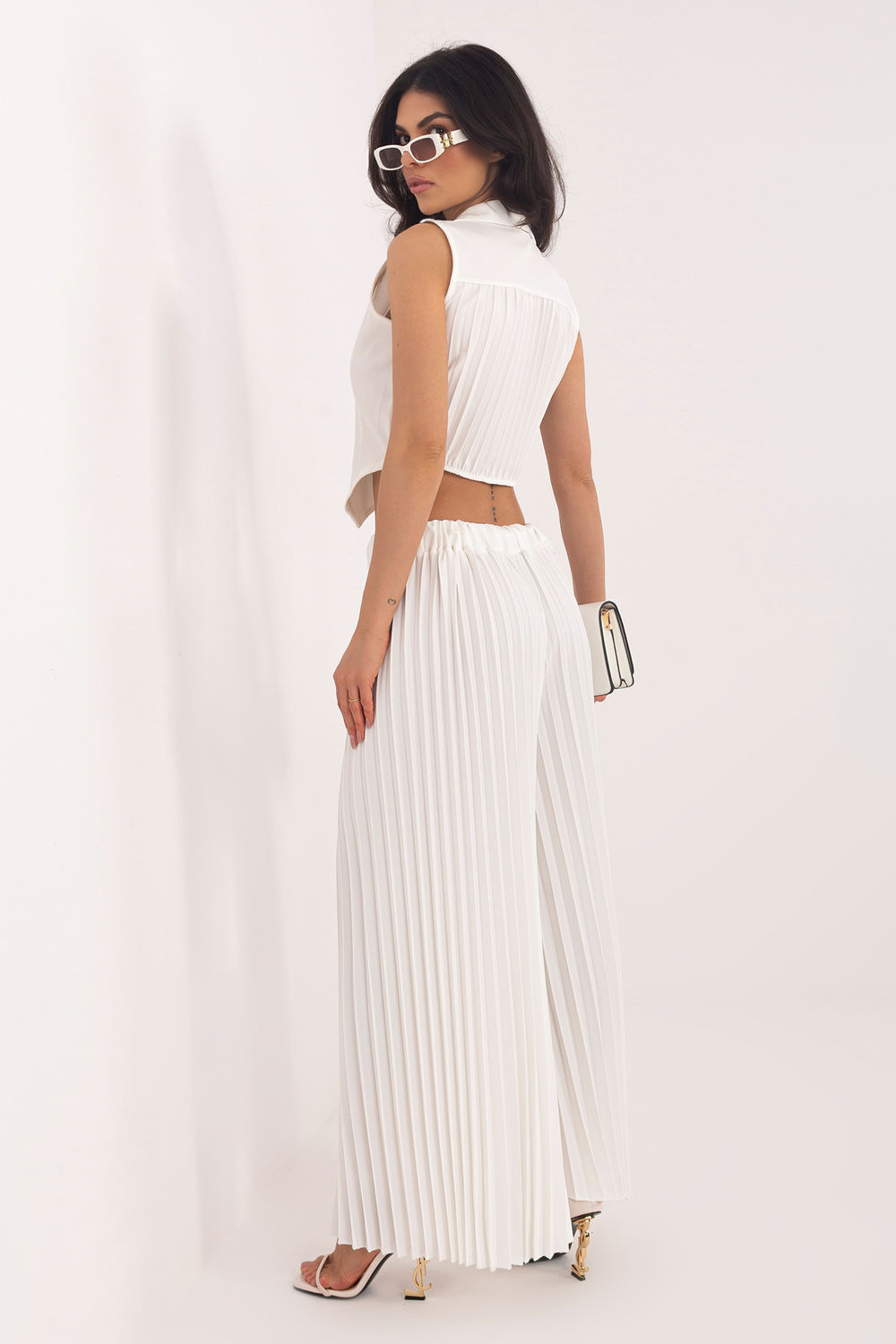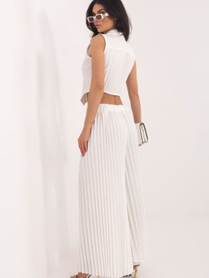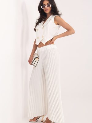 Το γυναικείο σύνολο που αποτελείται από γιλέκο και παντελόνι είναι μια κομψή και πολυδιάστατη πρόταση, που είναι κατάλληλη τόσο για καθημερινές στυλιστικές επιλογές, για δουλειά, όσο και για επίσημες περιστάσεις ή εκδηλώσεις. Ο συνδυασμός κλασικής γραμμής με μοντέρνα γραμμή δημιουργεί ένα σύνολο άνετο, αλλά ταυτόχρονα στυλάτο. Τα παντελόνια με μακριά, φαρδιά μπατζάκια είναι φτιαγμένα από συνδυασμό πολυεστέρα, βισκόζης και ελαστάνης, που εξασφαλίζει άνεση φορέματος, ελαφρύτητα και υπονοούμενη ελαστικότητα. Οι πτυχώσεις σε όλο το μήκος και η ελαστική ζώνη στη μέση εξασφαλίζουν άνετη εφαρμογή στη σιλουέτα και ελευθερία κινήσεων. Το διπλό γιλέκο χωρίς μανίκια έχει τελειωθεί με γιακά και κλείνει με κουμπιά, ενώ οι διακριτικές πτυχώσεις στην πλάτη προσθέτουν κομψότητα και αυθεντικό χαρακτήρα. Το λείο μοτίβο ολόκληρου του συνόλου του προσφέρει καθολικότητα και διαχρονικό στυλ. Είναι το ιδανικό σύνολο για γυναίκες που εκτιμούν την κομψότητα, την άνεση και τον μοντέρνο σχεδιασμό, που είναι κατάλληλο σε πολλές καταστάσεις από την εργασία, μέχρι κοινωνικές συναντήσεις και πιο επίσημες περιστάσεις.