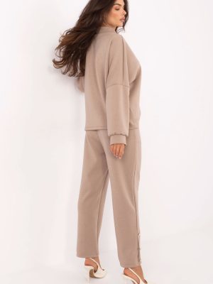 Το γυναικείο σύνολο σε casual στυλ είναι η ιδανική πρόταση για καθημερινή χρήση για γυναίκες που εκτιμούν την άνεση και τη διακριτική κομψότητα. Ραμμένο από μαλακό, ελαστικό υλικό τύπου βούτυρο (βισκόζη με προσθήκη ελαστάνης), διακρίνεται για την εξαιρετική του απαλότητα και την ευχάριστη αίσθηση στην αφή. Η μπλούζα κλείνει με κουμπί και έχει λαιμόκοψη σε σχήμα V, καθώς και μακριά μανίκια που προσθέτουν γυναικεία διάθεση στο σύνολο. Το παντελόνι με ψηλή μέση διαθέτει άνετη ελαστική ζώνη, ίσιες κνήμες και πρακτικές πλαϊνές τσέπες. Στο κάτω μέρος των κνημών και στη ζώνη υπάρχουν διακοσμητικά κουμπιά που αποτελούν στυλιστική λεπτομέρεια και επισημαίνουν τον μοναδικό χαρακτήρα του σετ. Το σύνολο είναι κατάλληλο ως άνετη και κομψή καθημερινή εμφάνιση, ομαλή, универсαλική και διαχρονική.