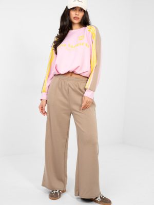 Ένα στυλάτο σύνολο φόρμας σε κανονικό ξετύλιγμα είναι η ιδανική πρόταση για καθημερινή χρήση. Το άνετο και ταυτόχρονα μοντέρνο σετ αποτελείται από μια μπλούζα με μακριά μανίκια και μακριά παντελόνια με πλατιά γραμμή, δημιουργώντας μια άνετη και σύγχρονη εμφάνιση. Η μπλούζα με στρογγυλή λαιμόκοψη έχει κοσμηθεί με μια εντυπωσιακή επιγραφή μπροστά, που προσδίδει χαρακτήρα σε όλο το σύνολο. Ένα επιπλέον πλεονέκτημα είναι οι διακοσμητικές ρίγες στα μανίκια, που τονίζουν τον αθλητικό, δυναμικό χαρακτήρα του μοντέλου. Τα παντελόνια με υψηλή μέση διαμορφώνουν όμορφα τη σιλουέτα και προσφέρουν άνεση στη χρήση. Στη μέση έχει ραμμένο ελαστικό λάστιχο, το οποίο κάνει τα παντελόνια να εφαρμόζουν τέλεια στη μέση. Οι πλατιές γραμμές προσδίδουν σε όλο το σύνολο μια χαλαρή, μοντέρνα εμφάνιση, ενώ οι πλαϊνές τσέπες ενισχύουν τη λειτουργικότητα του σετ. Το σύνολο είναι κατασκευασμένο από ευχάριστο στην αφή μείγμα πολυεστέρα, βισκόζης και ελαστάνης, το υλικό είναι μαλακό, ελαστικό και ανθεκτικό στις ζάρες, γεγονός που το καθιστά ιδανικό για καθημερινή χρήση. Ιδανική επιλογή για γυναίκες που εκτιμούν την άνεση, την ελευθερία και τη μοντέρνα εμφάνιση στις καθημερινές τους εμφανίσεις.