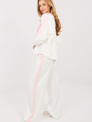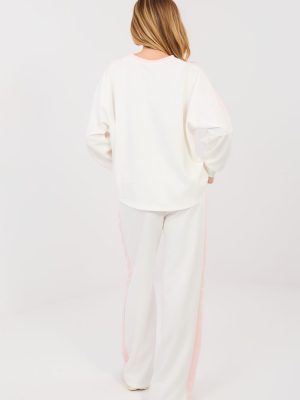Γυναικείο σετ φόρμας που αποτελείται από φούτερ και παντελόνι είναι μια άνετη και στιλάτη πρόταση για καθημερινές εμφανίσεις σε casual ύφος. Το μοντέλο είναι ιδανικό τόσο για καθημερινή χρήση όσο και για βόλτες ή χαλάρωση, συνδυάζοντας μοντέρνα εμφάνιση με μέγιστη άνεση. Οι διακοσμητικές επιγραφές και οι αριθμοί που τοποθετούνται στο μπροστινό μέρος του φούτερ και στους μανίκους προσδίδουν σε όλη την εικόνα έναν αθλητικό, σύγχρονο χαρακτήρα. Το σετ είναι κατασκευασμένο από υψηλής ποιότητας μείγμα πολυεστέρα, βισκόζης και ελαστάνης, εξασφαλίζοντας απαλότητα, ελαστικότητα και καλή προσαρμογή στη σιλουέτα. Το φούτερ διαθέτει μακριά μανίκια και κλασικό, στρογγυλό ντεκολτέ. Το παντελόνι με μακριά, φαρδιά μπατζάκια και υψηλή μέση εξασφαλίζει άνεση και ελευθερία κινήσεων. Οι πρακτικές, πλευρικές τσέπες αυξάνουν τη λειτουργικότητα του συνόλου. Επιπλέον πλεονέκτημα είναι οι λουρίδες στα μπατζάκια και στους μανίκους, οι οποίες τονίζουν το αθλητικό στυλ και οπτικά λεπταίνουν τη σιλουέτα.