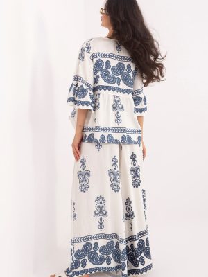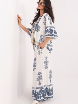 Το γυναικείο σύνολο σε στυλ boho είναι μια ελαφριά και κομψή πρόταση ιδανική για καθημερινή χρήση. Η χαλαρή γραμμή και το μοντέρνο σχέδιο προσδίδουν στη συνολική εμφάνιση μια μοναδική, καλλιτεχνική χαρακτήρα, που ενσωματώνεται τέλεια σε χαλαρές, γυναικείες στυλιστικές επιλογές. Το σετ αποτελείται από μπλούζα και παντελόνι που είναι κατασκευασμένα από ένα μείγμα rayon και πολυαμίδιο, εξασφαλίζοντας αναπνοή, ελαφρότητα και άνεση κατά την εφαρμογή. Η μπλούζα με μανίκια 3/4 διαθέτει στρογγυλή λαιμόκοψη με κορδόνι, το οποίο προσθέτει μια διακριτική κομψότητα και επιτρέπει ελαφριά ρύθμιση. Το παντελόνι με μακριές ποδιές έχει σχεδιαστεί με γνώμονα την άνεση, διαθέτει κορδόνι στη μέση που επιτρέπει την τέλεια εφαρμογή στη σιλουέτα. Η χαλαρή γραμμή εξασφαλίζει ελευθερία κινήσεων, και το όλο σύνολο συνθέτει μια αρμονική, κομψή επιλογή για καθημερινή χρήση. Είναι μια εξαιρετική επιλογή για γυναίκες που εκτιμούν την άνεση, τα φυσικά υλικά και το μοναδικό boho στυλ.