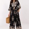 Μια κομψή γυναικεία σετ σε casual στυλ, ιδανικό για καθημερινή χρήση αλλά και για το γραφείο. Αποτελείται από ένα προσαρμοσμένο γιλέκο και παντελόνι με φαρδιές γραβάτες, δημιουργώντας ένα μοντέρνο και άνετο σύνολο με λεπτές, κομψές λεπτομέρειες. Το γιλέκο χωρίς μανίκια που κλείνει με κουμπιά έχει κλασικό V λαιμόκοψη που αναδεικνύει όμορφα τη γραμμή του λαιμού. Με διακοσμητική κεντημένη λεπτομέρεια και ζώνη που κλείνει στη μέση, τονίζει την σιλουέτα και προσθέτει πρωτοτυπία στην εμφάνιση. Το παντελόνι με ψηλή μέση και φαρδιές γραβάτες που διαρκώς επιμηκύνει οπτικά τα πόδια, ενώ οι πλαινές τσέπες προσφέρουν πρακτικότητα χωρίς να θυσιάζουν την κομψή εμφάνιση. Κατασκευασμένο από ελαστικό υλικό, έναν συνδυασμό πολυεστέρα και ελαστάνης, το σετ εγγυάται άνεση όλη την ημέρα διατηρώντας ταυτόχρονα ένα μοντέρνο, προσεγμένο look.