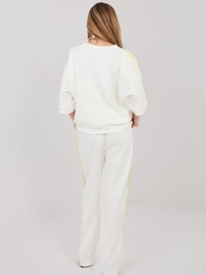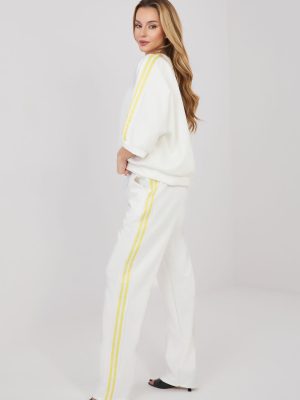 Γυναικείο σετ φόρμας που αποτελείται από φούτερ και παντελόνι, ιδανικό για καθημερινές εμφανίσεις casual. Το ομαλό σχέδιο καθιστά το σετ ευρύχωρο και εύκολα προσαρμόσιμο σε διάφορες περιστάσεις, από βόλτες, αγορές μέχρι χαλάρωση στο σπίτι. Το σετ έχει κατασκευαστεί από ευχάριστο στη χρήση μείγμα πολυεστέρα, βισκόζης και ελαστάνης. Το υλικό τύπου “βούτυρο” είναι εξαιρετικά μαλακό, λεπτό και εξαιρετικά ευχάριστο στην αφή, εξασφαλίζοντας υψηλή άνεση κατά τη φθορά και ελευθερία κινήσεων. Το παντελόνι διαθέτει ψηλό ίσιο μηρό και μακριά, ίσια πόδια που εφαρμόζουν καλά στη σιλουέτα. Στη μέση υπάρχει πρακτική ρύθμιση που επιτρέπει την προσαρμογή στη σιλουέτα. Το μοντέλο είναι επίσης εξοπλισμένο με άνετα, πλάγια τσέπη. Το φούτερ με μανίκια μήκους μέχρι τον αγκώνα συμπληρώνει άριστα το σύνολο του σετ. Ένα επιπλέον διακοσμητικό στοιχείο είναι οι τάπες που τρέχουν κατά μήκος των μανικιών και των ποδιών, δίνοντας στο σετ αθλητικό και σύγχρονο χαρακτήρα.