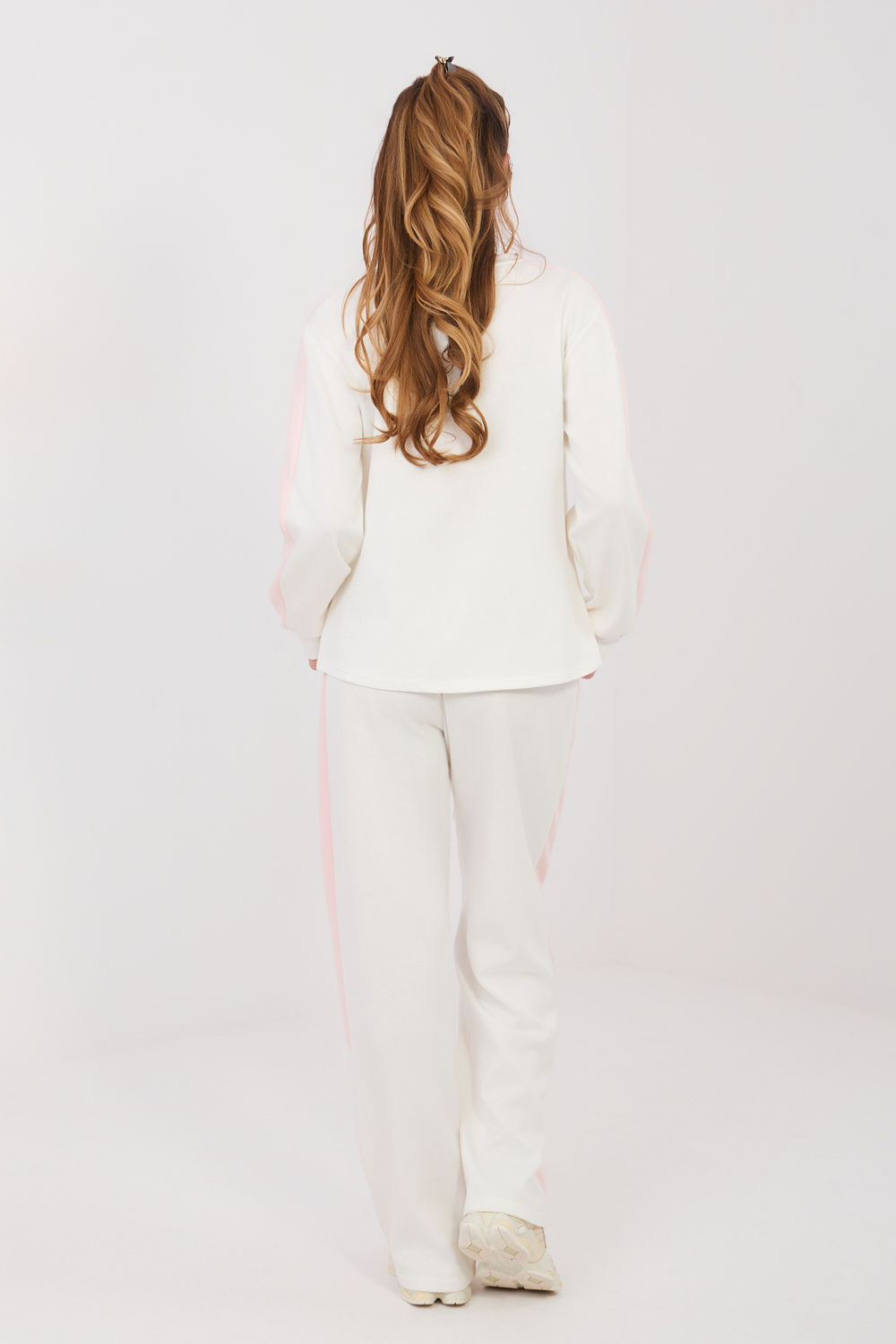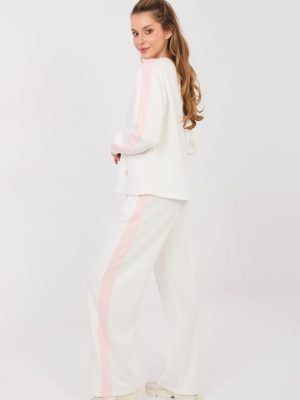 Αυτό το γυναικείο σετ φόρμας που αποτελείται από φούτερ και παντελόνι είναι η ιδανική πρόταση για καθημερινή χρήση για γυναίκες που εκτιμούν την άνεση, την ελευθερία κινήσεων και το μοντέρνο, casual στυλ. Το μαλακό υλικό τύπου μπεζ είναι εξαιρετικά απαλό και ευχάριστο στην αφή, καθιστώντας το σετ ιδανικό τόσο για χαλάρωση στο σπίτι όσο και για καθημερινές εξόδους. Το φούτερ με τα μακριά μανίκια και τις ρίγες είναι διακοσμημένο με έναν υποδειγματικό μοτίβο καρδιών στο μπροστινό μέρος, που προσθέτει στη συνολική γυναικεία και κοριτσίστικη αίσθηση. Οι φαρδιές μπατζάκια του παντελονιού με τις μοντέρνες ρίγες οπτικά αδυνατίζουν τη σιλουέτα, ενώ η ψηλή μέση τονίζει όμορφα την μέση και εξασφαλίζει άνεση κατά την χρήση. Η ρυθμιζόμενη μέση με κορδόνια επιτρέπει την τέλεια εφαρμογή, ενώ οι πλαϊνές τσέπες αυξάνουν τη λειτουργικότητα του σετ. Αυτός είναι ένας φόρμα που συνδυάζει την άνεση με την μοντέρνα εμφάνιση. Ιδανικό για βόλτες, ψώνια, ταξίδια ή χαλαρές μέρες στο σπίτι, πάντα όταν θέλεις να νιώθεις άνετα και κομψά ταυτόχρονα.