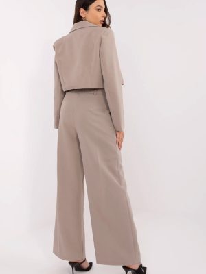 Ένα στυλάτο γυναικείο σύνολο που αποτελείται από μια κοντή σακάκι και μακριά παντελόνια είναι η ιδανική πρόταση για τις γυναίκες που εκτιμούν τον συνδυασμό της κομψότητας και της άνεσης. Η σακάκι με πέτο και γιακά κλείνει με κουμπί, ενώ οι ραμμένες ώμοι δίνουν στη σιλουέτα έντονη, γυναικεία μορφή και την διαμορφώνουν ελαφρώς. Τα παντελόνια με μακριά, φαρδιά μπατζάκια και ψηλή μέση τονίζουν εξαιρετικά τη μέση και οπτικά επιμηκύνουν τα πόδια. Το κλείσιμο με φερμουάρ και κουμπί εγγυάται άνεση κατά την wearing, ενώ οι πλαϊνές τσέπες προσθέτουν πρακτικότητα. Το σύνολο εντυπωσιάζει με την καλοσχεδιασμένη γραμμή και τον универсальний χαρακτήρα του, ιδανικά για καθημερινές εμφανίσεις, αλλά και για πιο κομψές στυλιστικές επιλογές. Ιδανική επιλογή για το γραφείο, για συναντήσεις ή εξόδους μετά τη δουλειά.