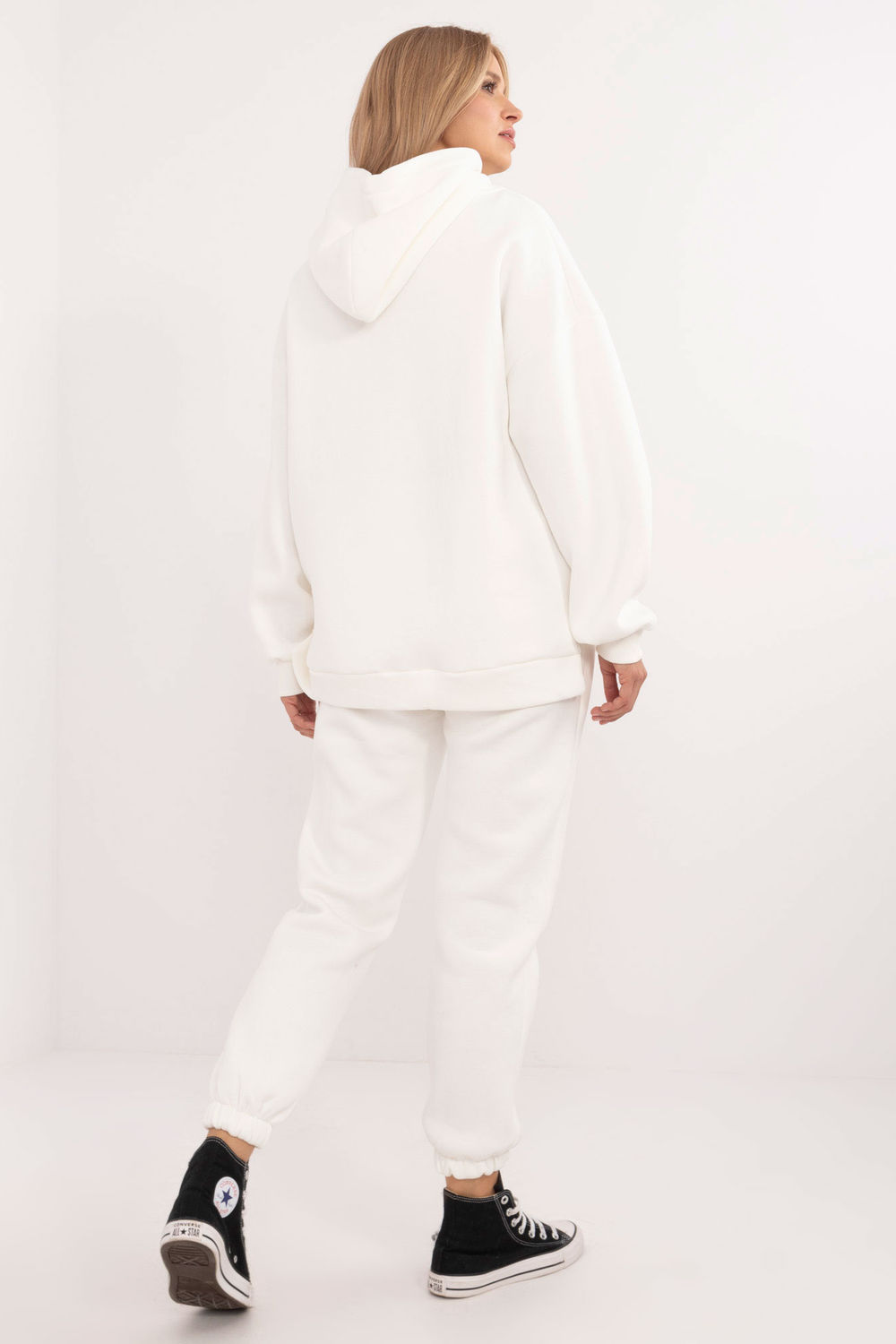 Ένα ζεστό γυναικείο casual σετ φούτερ, ιδανικό για τις καθημερινές κρύες μέρες, αποτελείται από φούτερ και παντελόνι. Το σετ είναι κατασκευασμένο από μαλακό και ζεστό μείγμα βαμβακιού/πολυεστέρα για άνεση και αντοχή. Το φούτερ έχει μακριά μανίκια, κουκούλα και μια μεγάλη, πρακτική τσέπη καγκουρό που προσθέτει μια σπορ πινελιά και λειτουργικότητα. Χάρη στη μόνωση, το φούτερ είναι ιδανικό για τις κρύες μέρες, ενώ το μονόχρωμο μοτίβο του προσθέτει μια κλασική, ευέλικτη εμφάνιση. Το παντελόνι με μακριά πόδια που καταλήγει σε μανσέτες με ραβδώσεις έχει ψηλή μέση, η οποία τονίζει τη μέση και εξασφαλίζει άνεση. Υπάρχει ένα δέσιμο στη μέση για τέλεια εφαρμογή. Επιπλέον, το παντελόνι διαθέτει πλαϊνές τσέπες που μπαίνουν στο παντελόνι, καθιστώντας το μια πρακτική επιλογή για καθημερινή χρήση. Όλο το σετ συνδυάζει στυλ, άνεση και ζεστασιά, αποτελώντας την ιδανική επιλογή για casual styling.