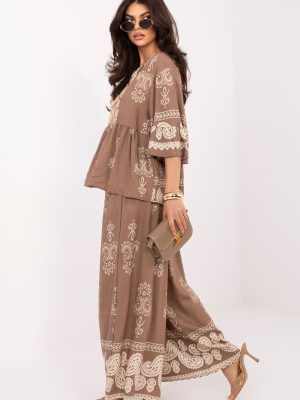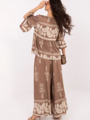 Το γυναικείο σετ σε boho στυλ είναι μια ελαφριά και κομψή πρόταση ιδανική για καθημερινή χρήση. Η χαλαρή γραμμή και η μοντέρνα εκτύπωση προσδίδουν στο σύνολο έναν μοναδικό, καλλιτεχνικό χαρακτήρα, που ταιριάζει τέλεια σε χαρούμενες, γυναικείες στυλιστικές επιλογές. Το σετ αποτελείται από μπλούζα και παντελόνι, κατασκευασμένα από μείγμα βιίσκωσης και πολυαμιδίου, εξασφαλίζοντας διαπνοή, ελαφρότητα και άνεση κατά την φθορά. Η μπλούζα με μανίκια 3/4 έχει στρογγυλή λαιμόκοψη με κορδόνι, που προσθέτει μια διακριτική κομψότητα και επιτρέπει ήπια ρύθμιση. Το παντελόνι με μακριές ποδιές έχει σχεδιαστεί με γνώμονα την άνεση, διαθέτει κορδόνι στη μέση, το οποίο επιτρέπει την τέλεια εφαρμογή στο σώμα. Η χαλαρή γραμμή εξασφαλίζει ελευθερία κινήσεων και το σύνολο δημιουργεί μια αρμονική, κομψή επιλογή για καθημερινή χρήση. Είναι μια εξαιρετική επιλογή για γυναίκες που εκτιμούν την άνεση, τα φυσικά υλικά και το εναλλακτικό, boho στυλ.